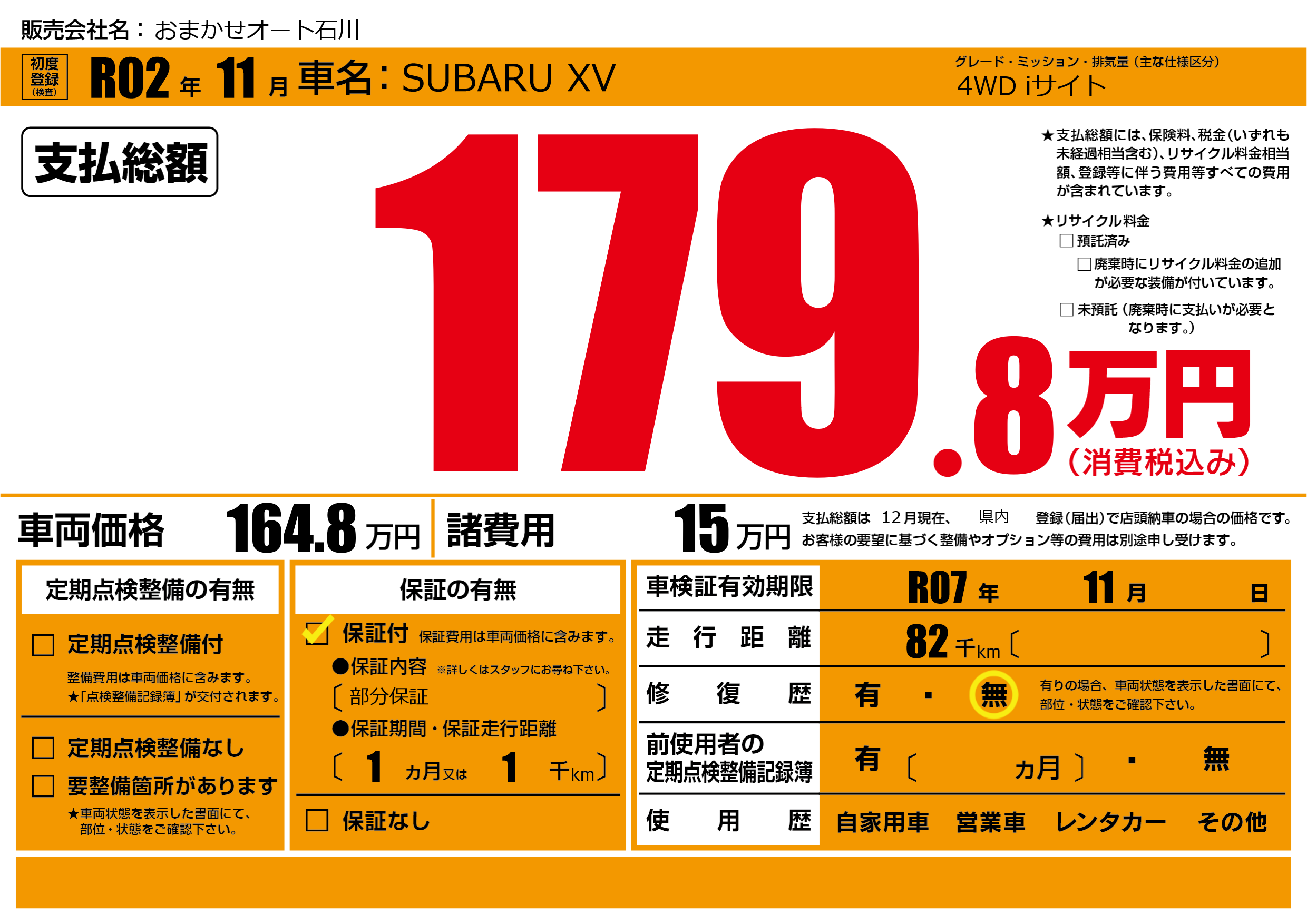 | 車名 | SUBARU XV | グレード ミッション 排気量 |