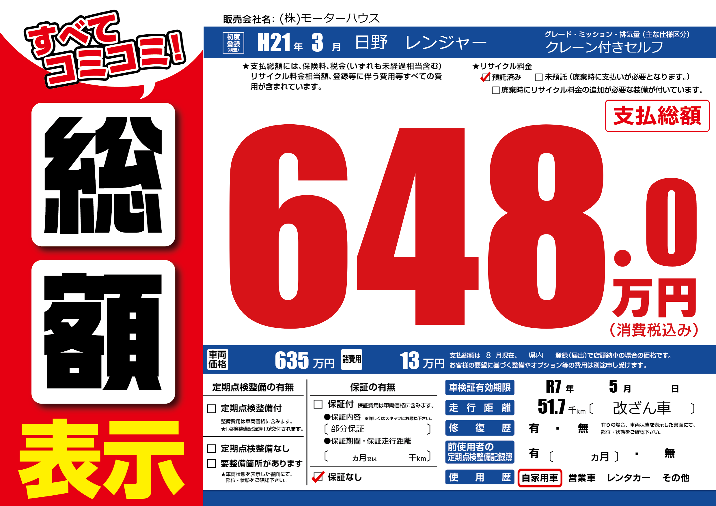 | 車名 | 日野 レンジャー | グレード ミッション 排気量 |
