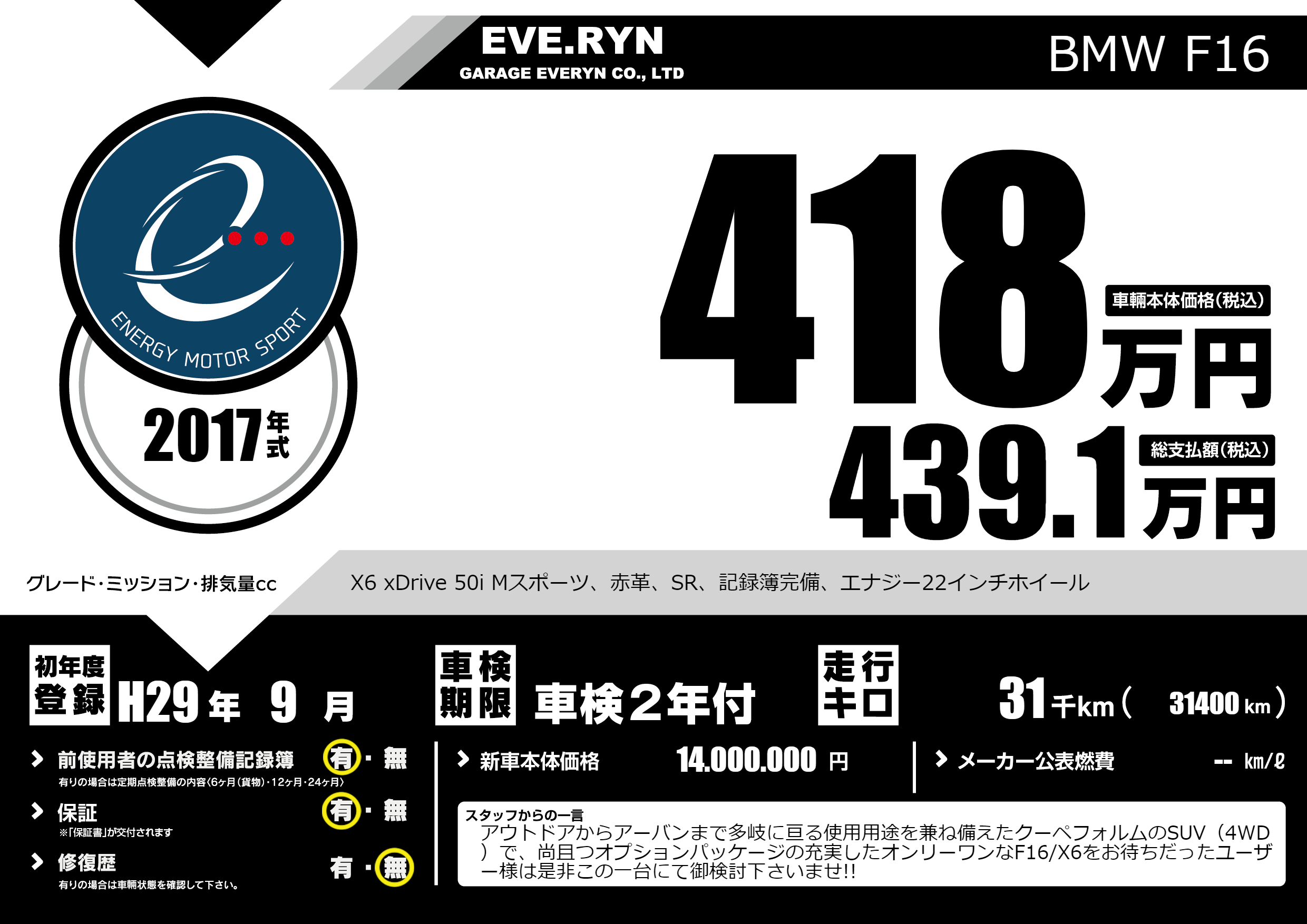 | 車名 | BMW F16 | グレード ミッション 排気量 |