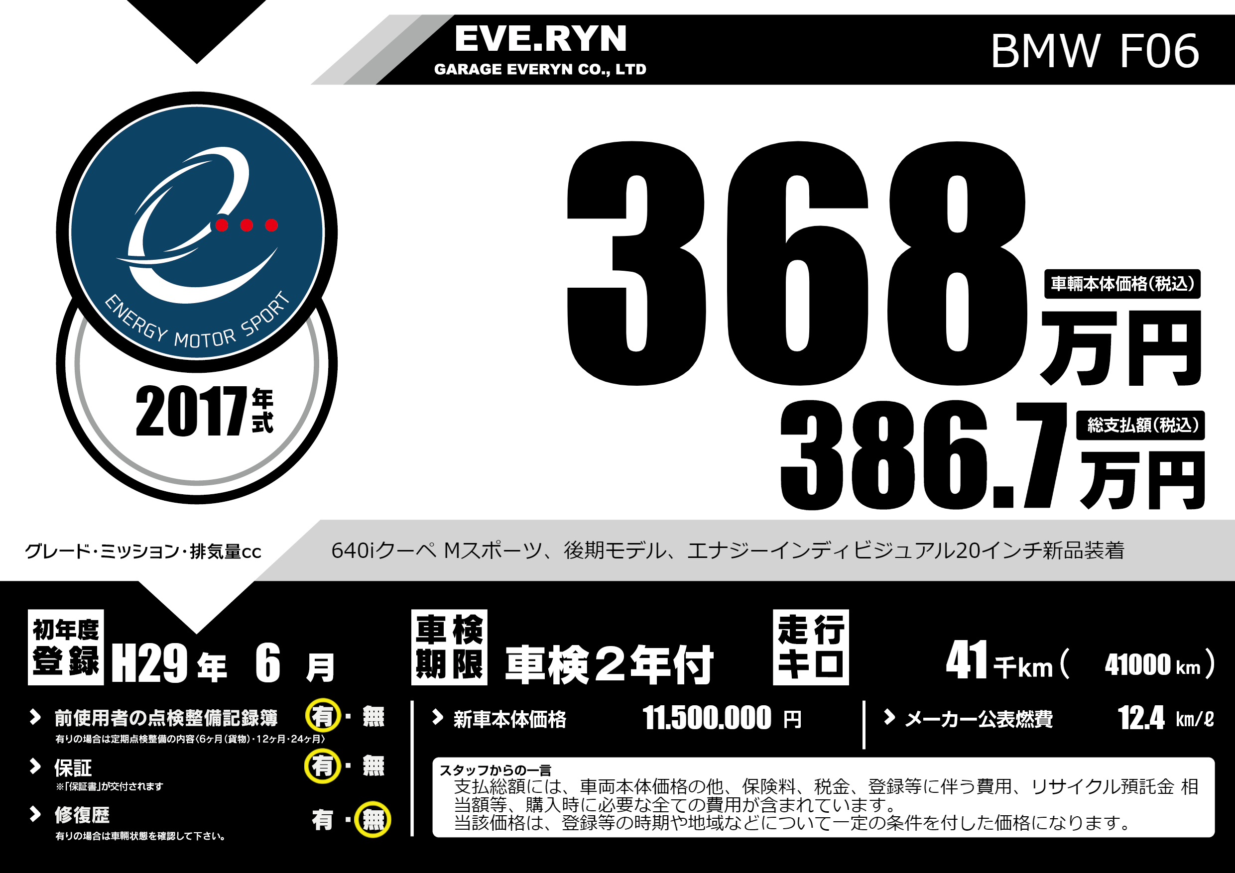 640iクーペ Mスポーツ、後期モデル、エナジーインディビジュアル20インチ新品装着 |