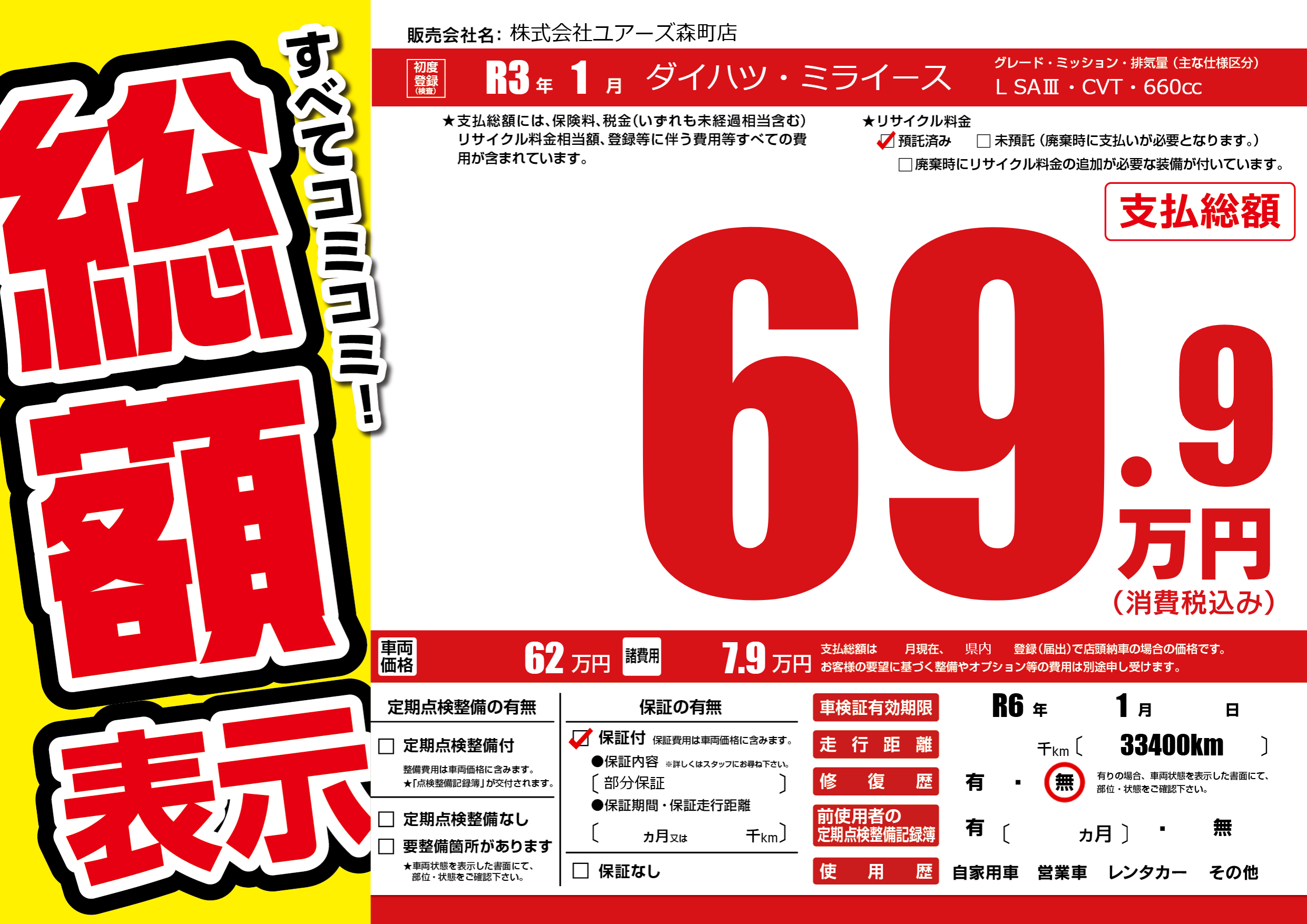 | 車名 | ダイハツ・ミライース | グレード ミッション 排気量 |
