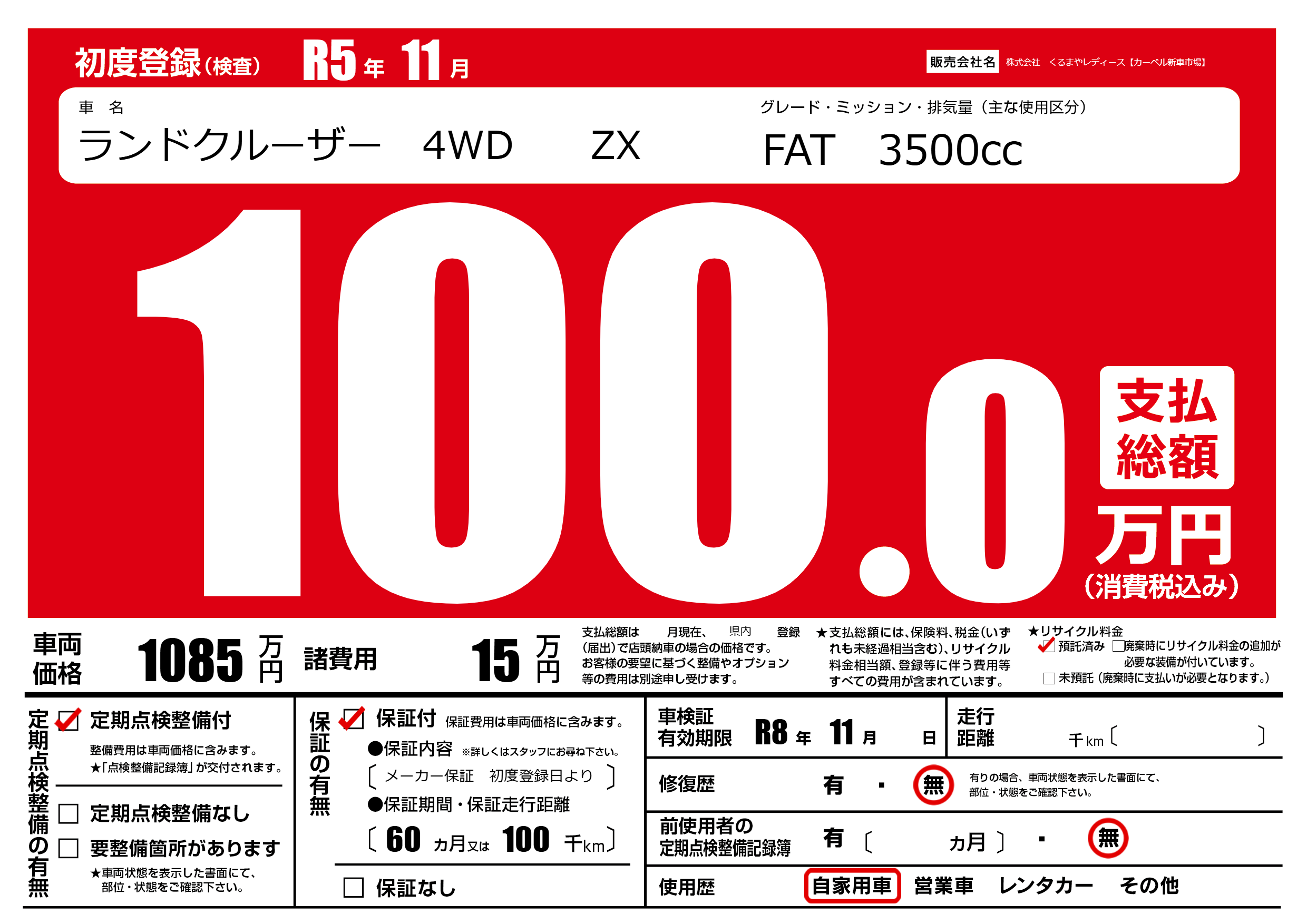 保証付き 保証内容(メーカー保証 初度登録日より) 60ヶ月または(100)千kmまで |
