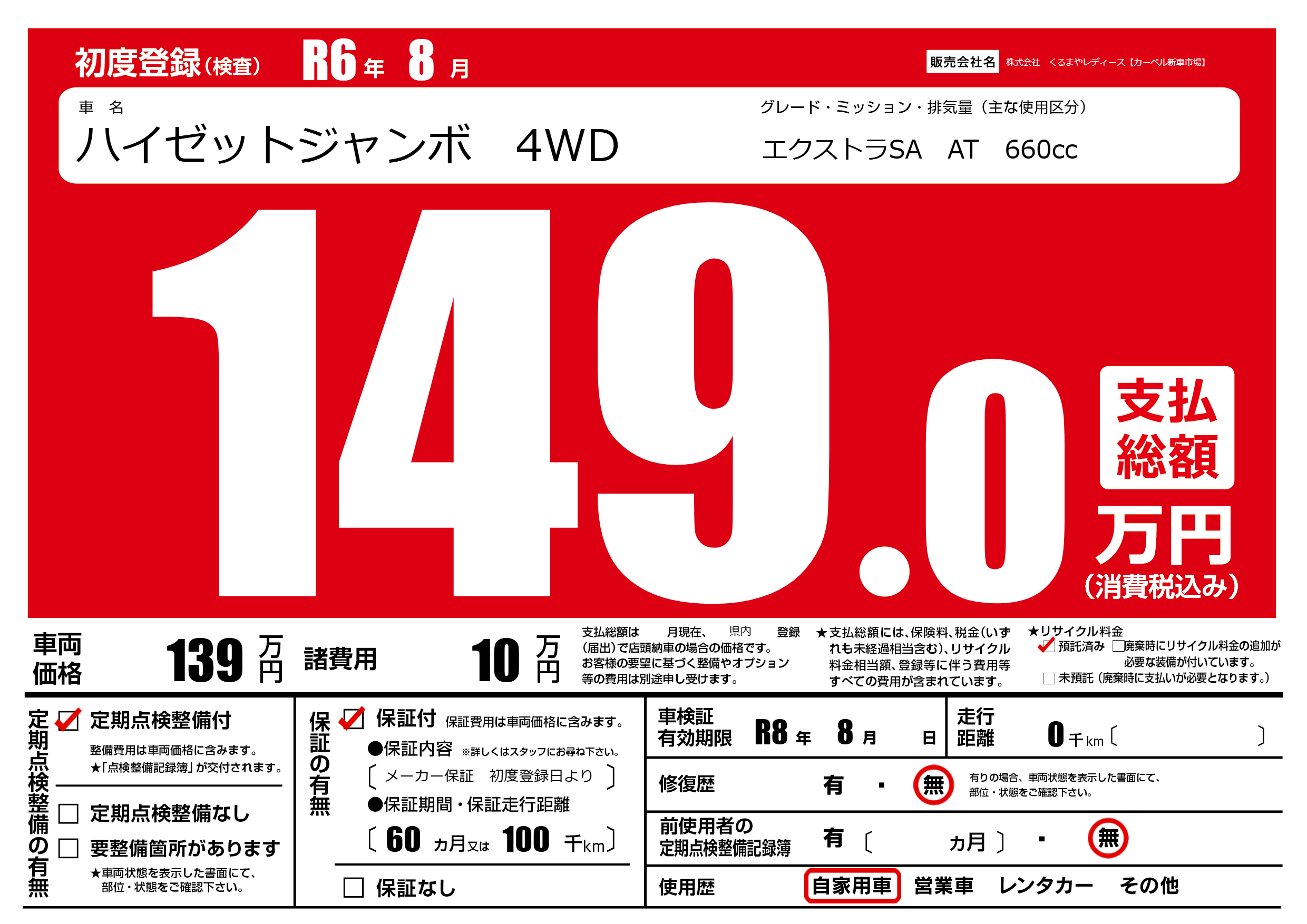 | 走行キロ | - | 初年度登録 | R6年8月 |