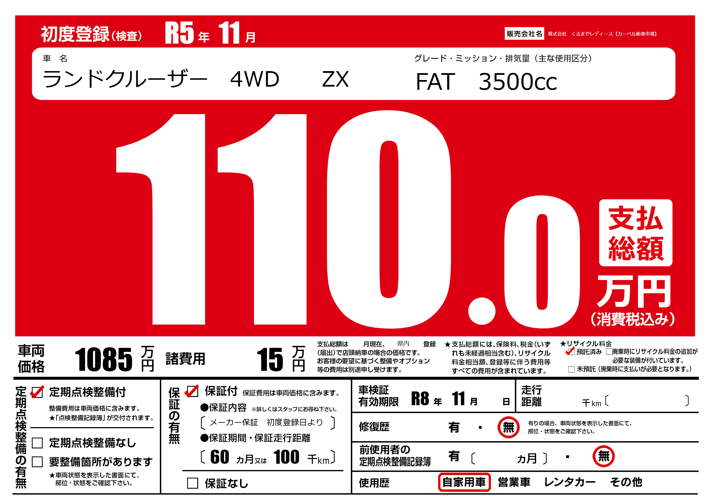 | 車名 | ランドクルーザー 4WD ZX | グレード ミッション 排気量 |
