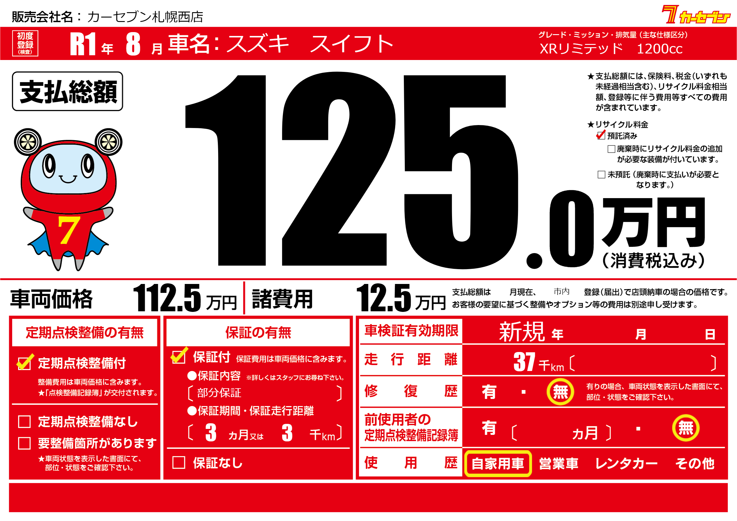 | 走行キロ | 3.7万km | 初年度登録 | R1年8月 |