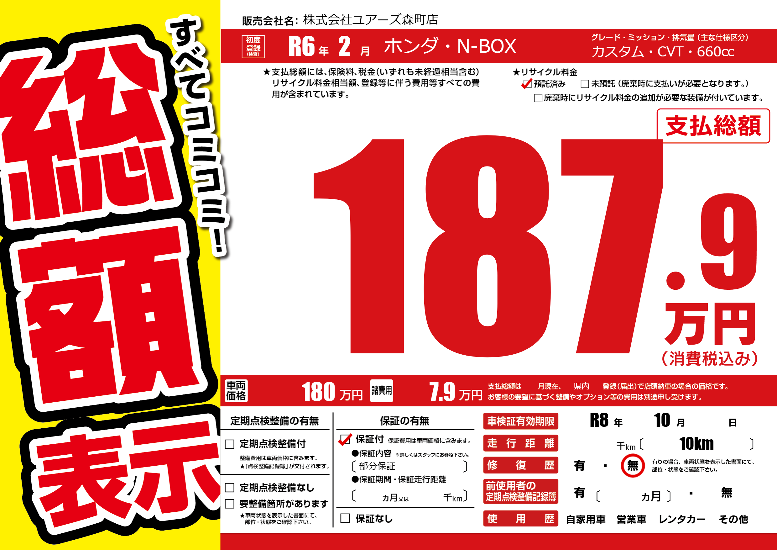 | 車名 | ホンダ・N-BOX | グレード ミッション 排気量 |