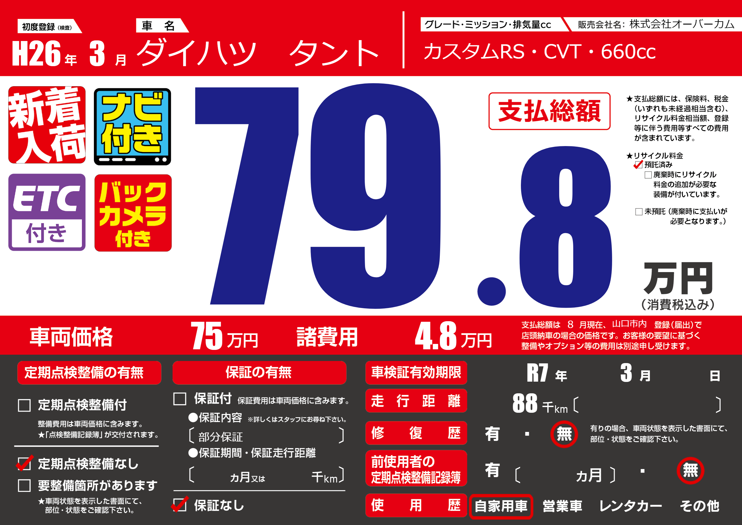| 車名 | ダイハツ タント | グレード ミッション 排気量 |