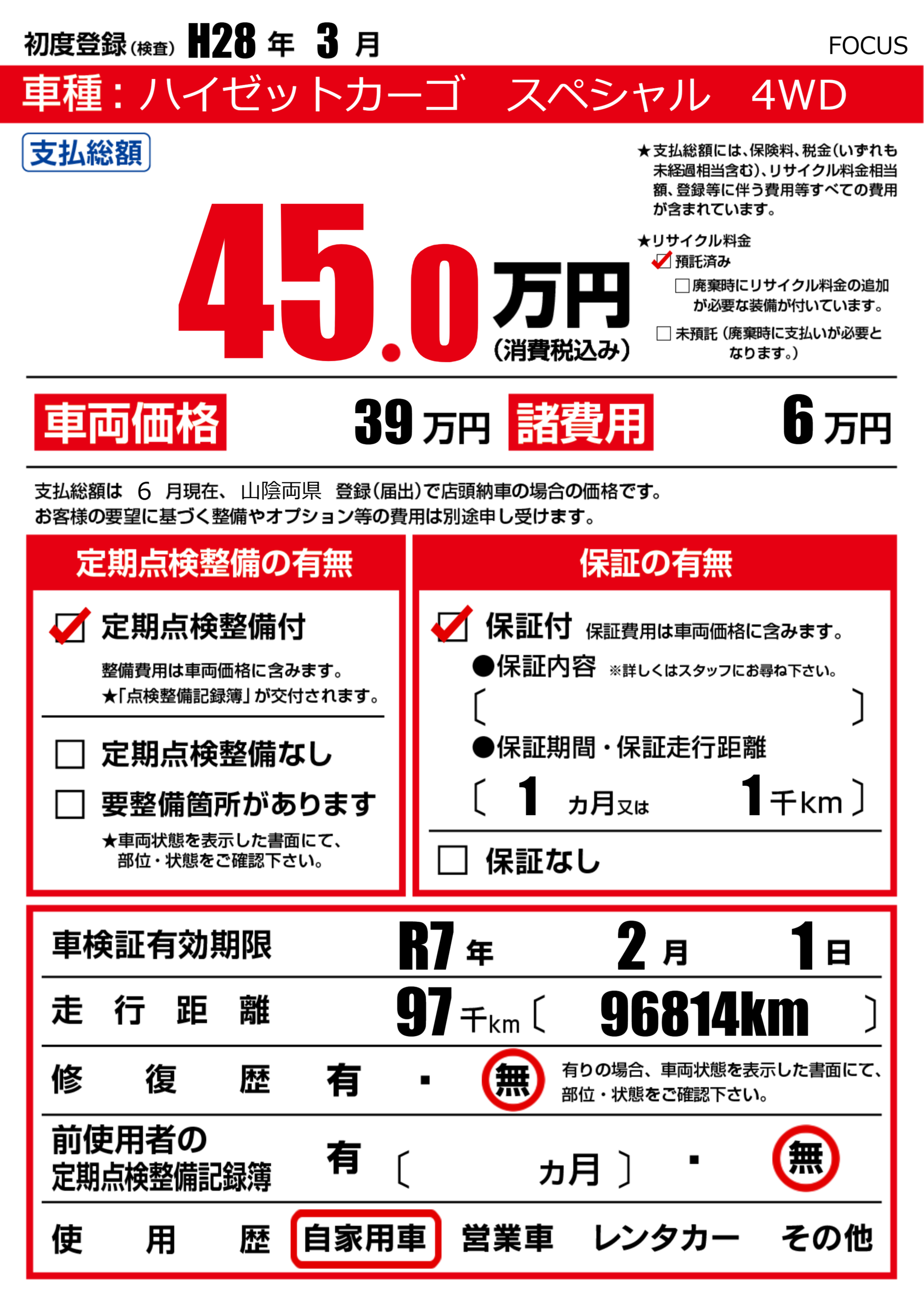 | 車名 | ハイゼットカーゴ スペシャル 4WD | グレード ミッション 排気量 |
