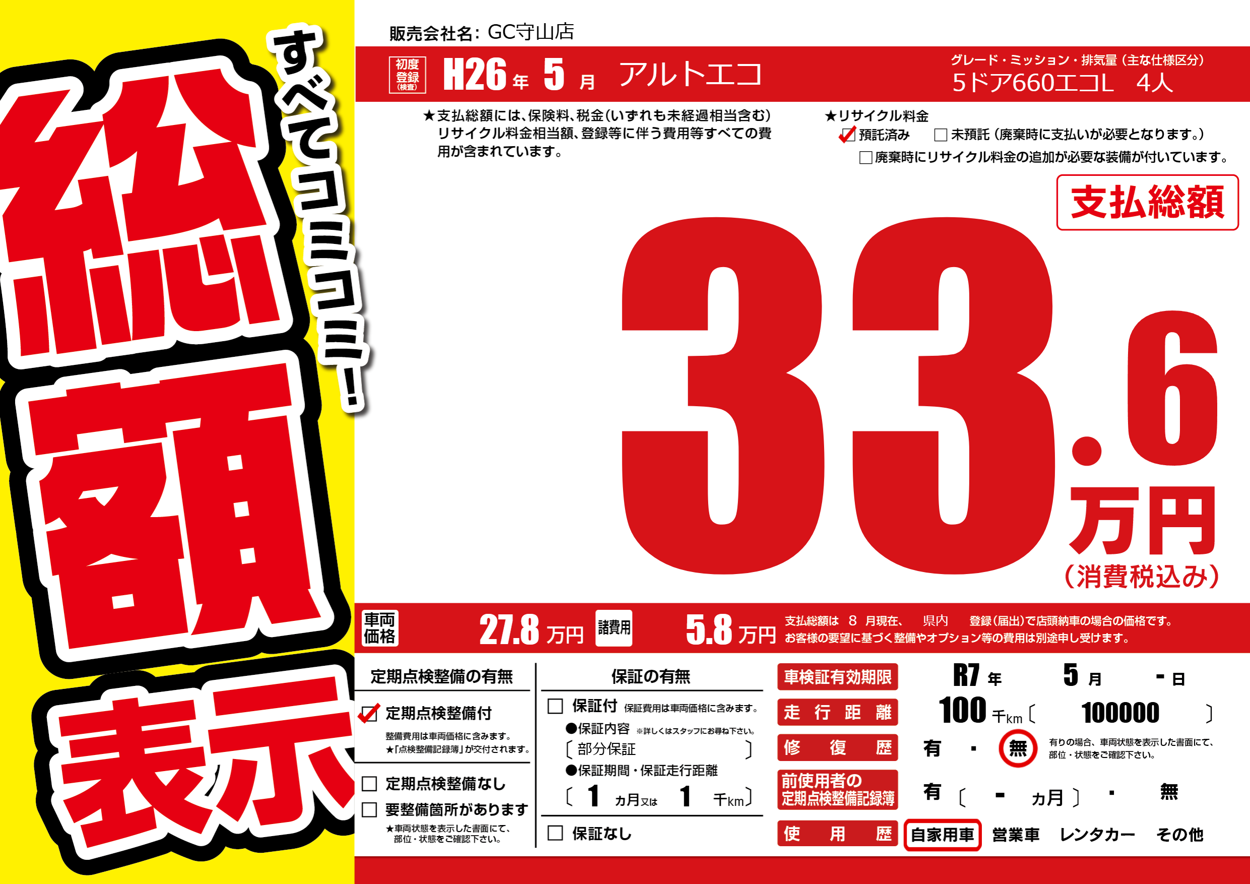 | 走行キロ | 10万km | 初年度登録 | H26年5月 |