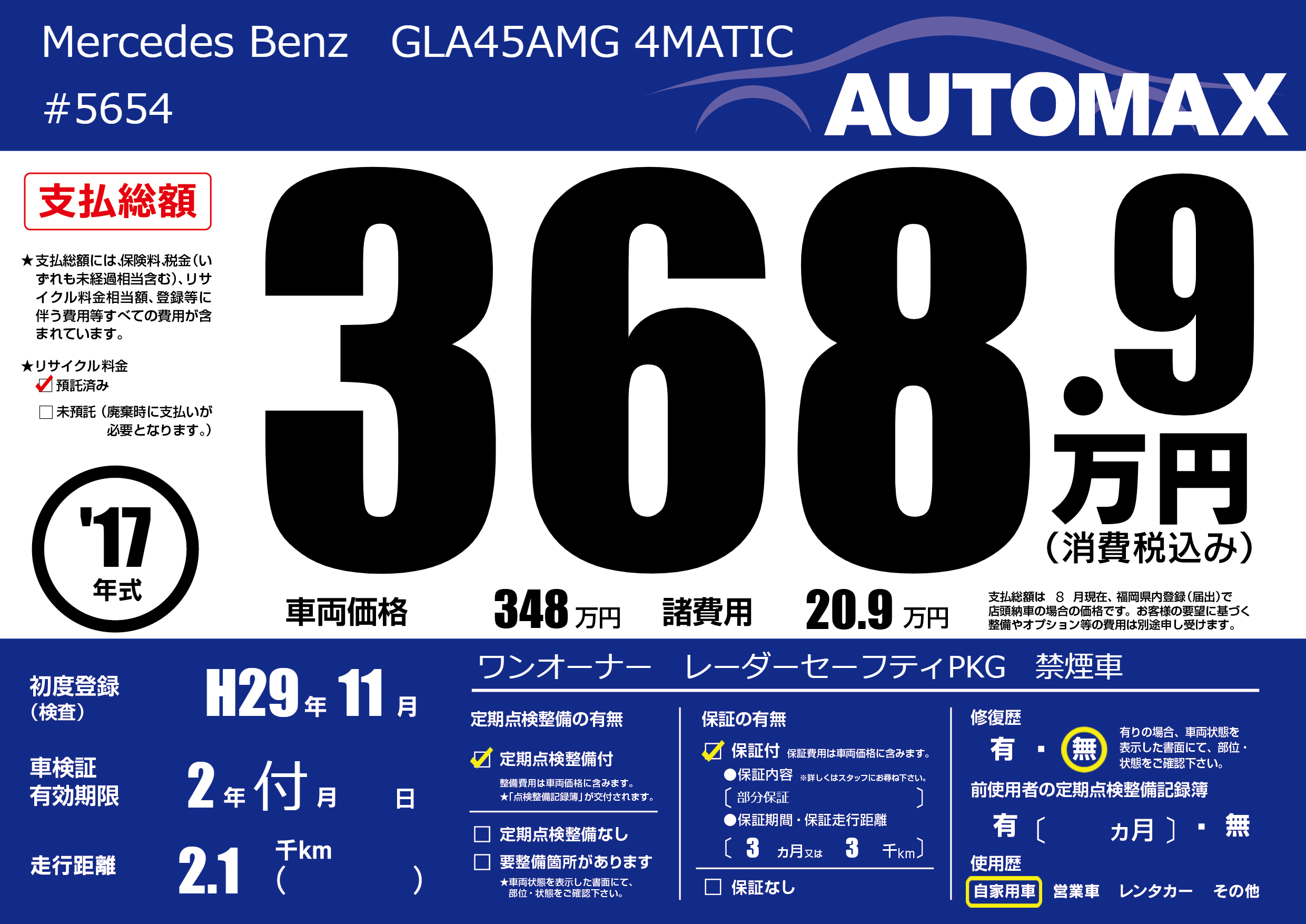 | 車名 | Mercedes Benz GLA45AMG 4MATIC | グレード ミッション 排気量 |