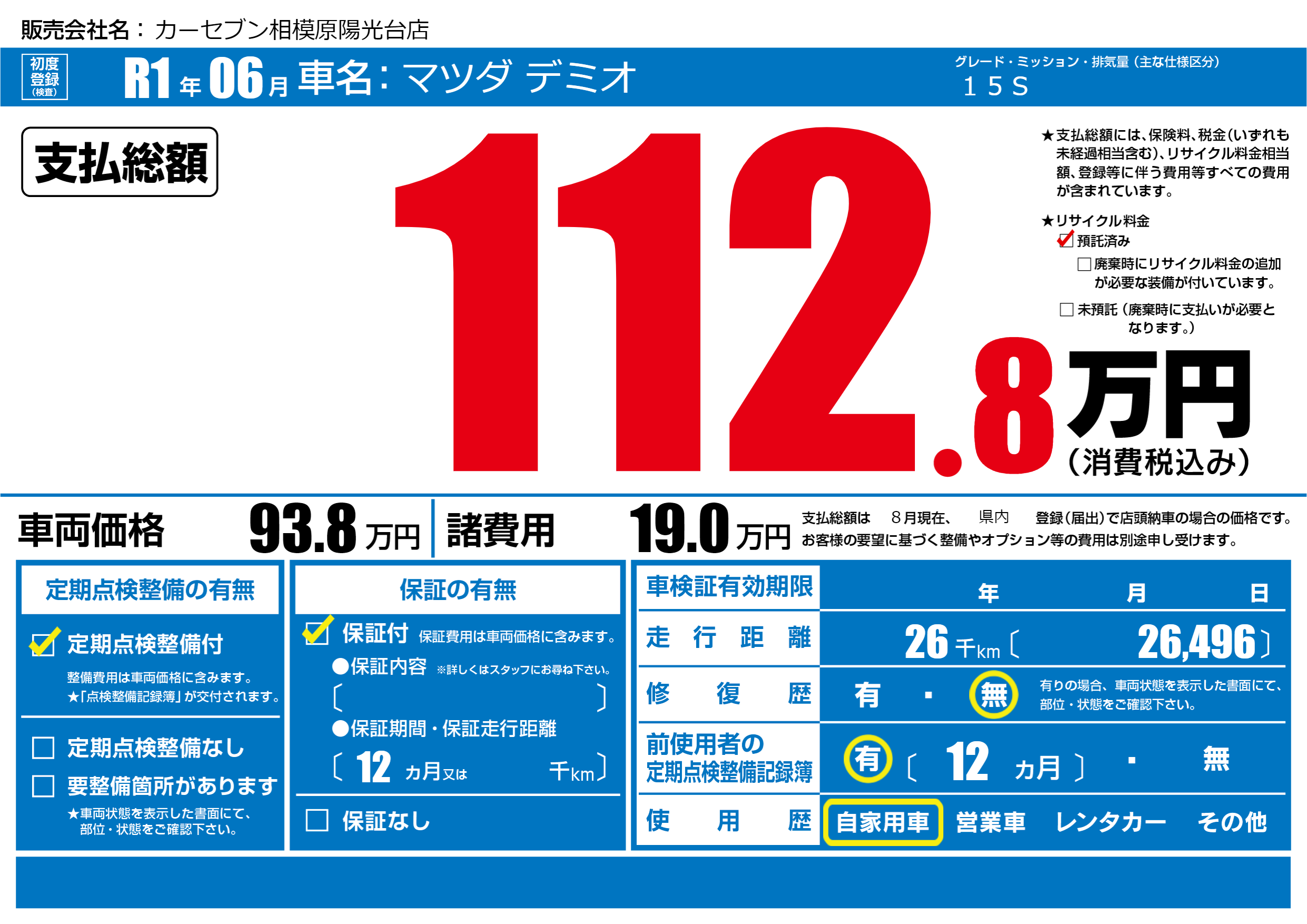 保証付き 保証内容(---) 12ヶ月または()千kmまで |
