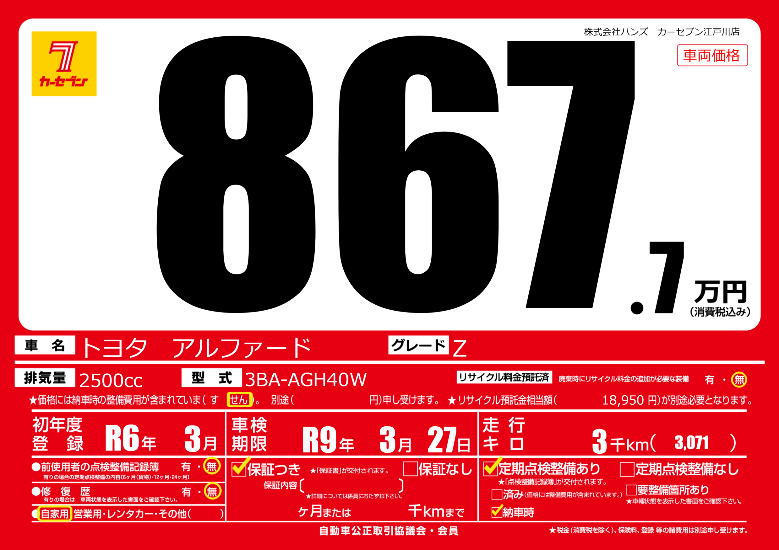 | 走行キロ | 0.3万km | 初年度登録 | R6年3月 |