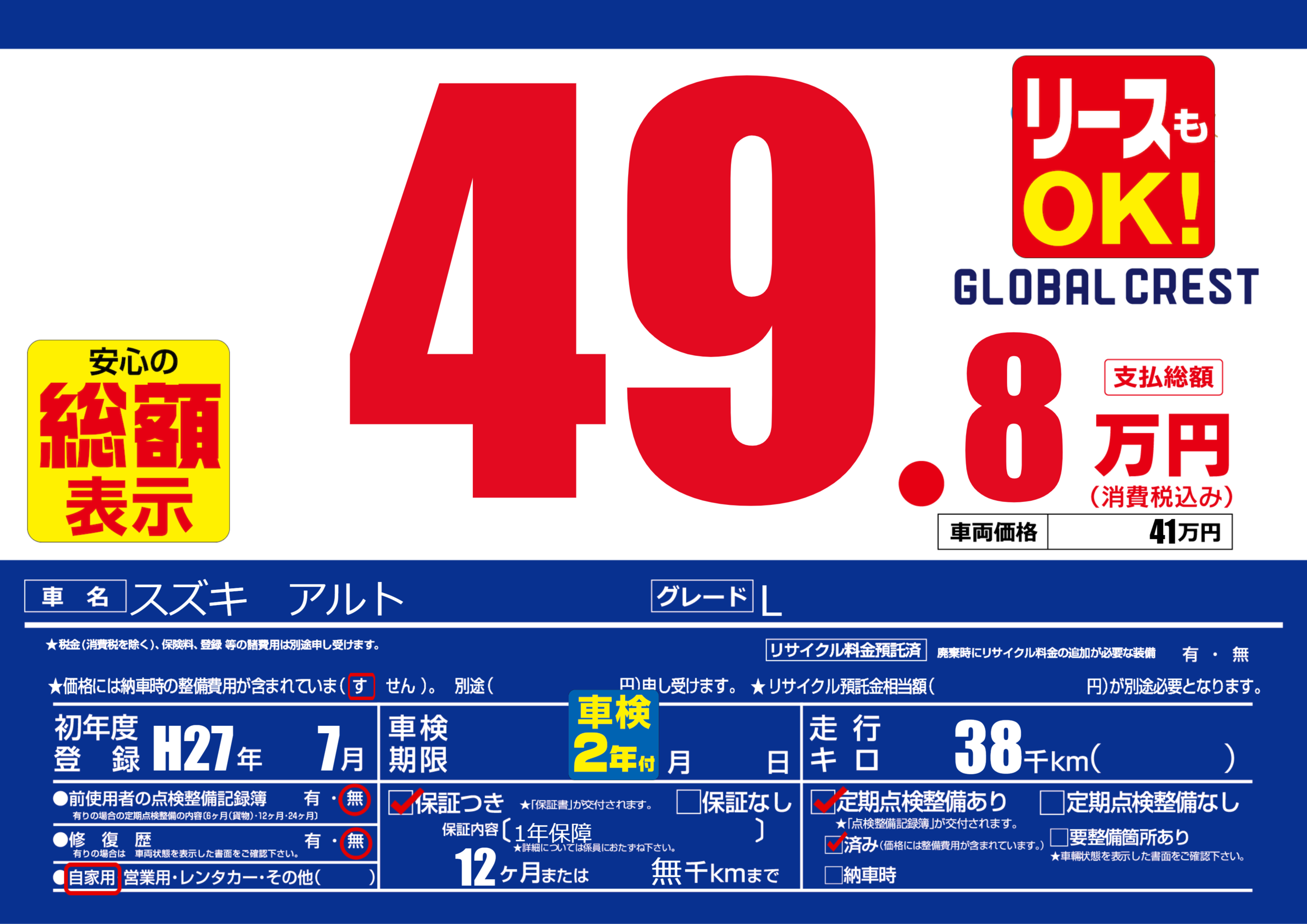 | 定期点検整備 | 定期点検整備あり 定期点検整備済み | ||