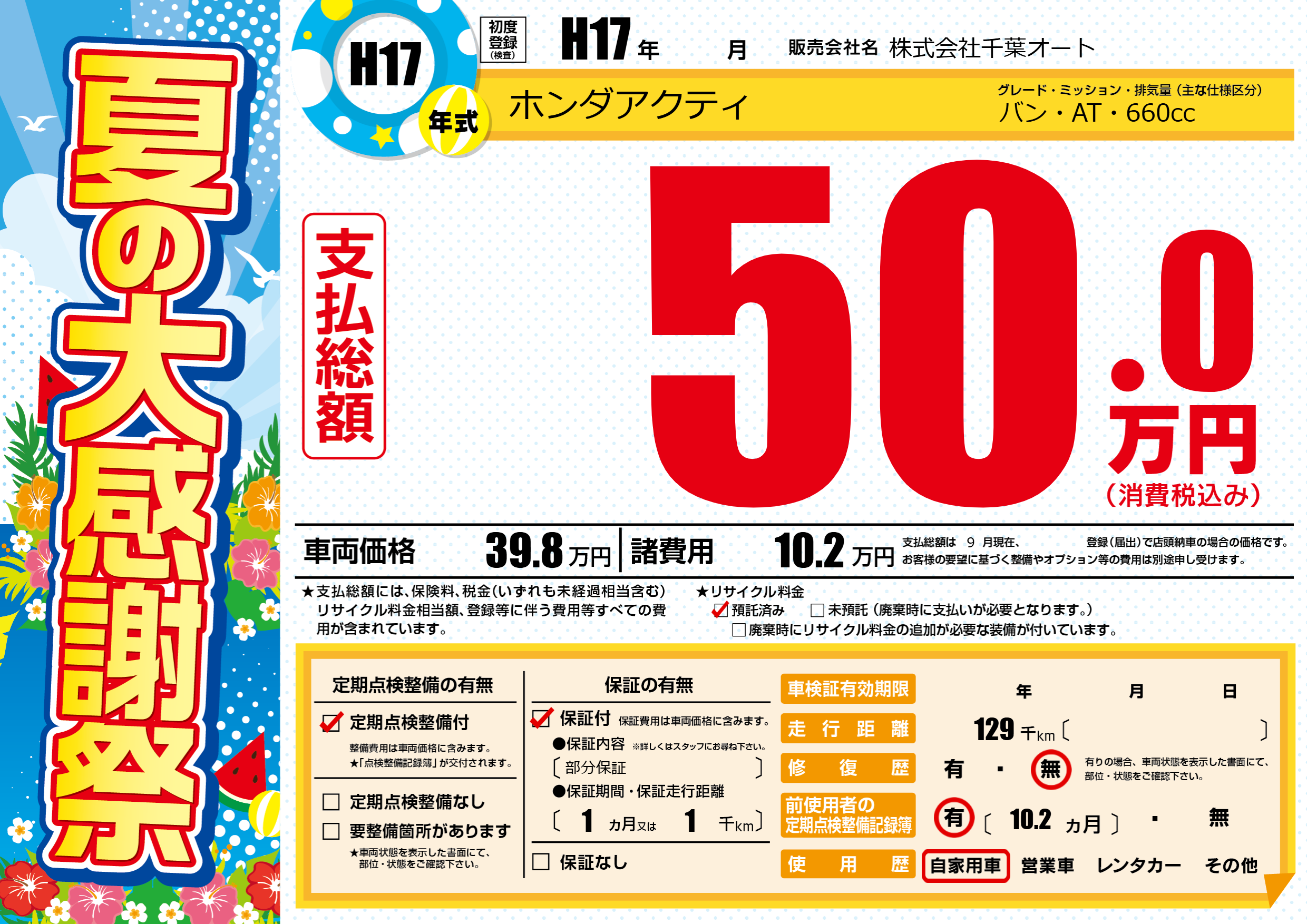 | 車名 | ホンダアクティ | グレード ミッション 排気量 |