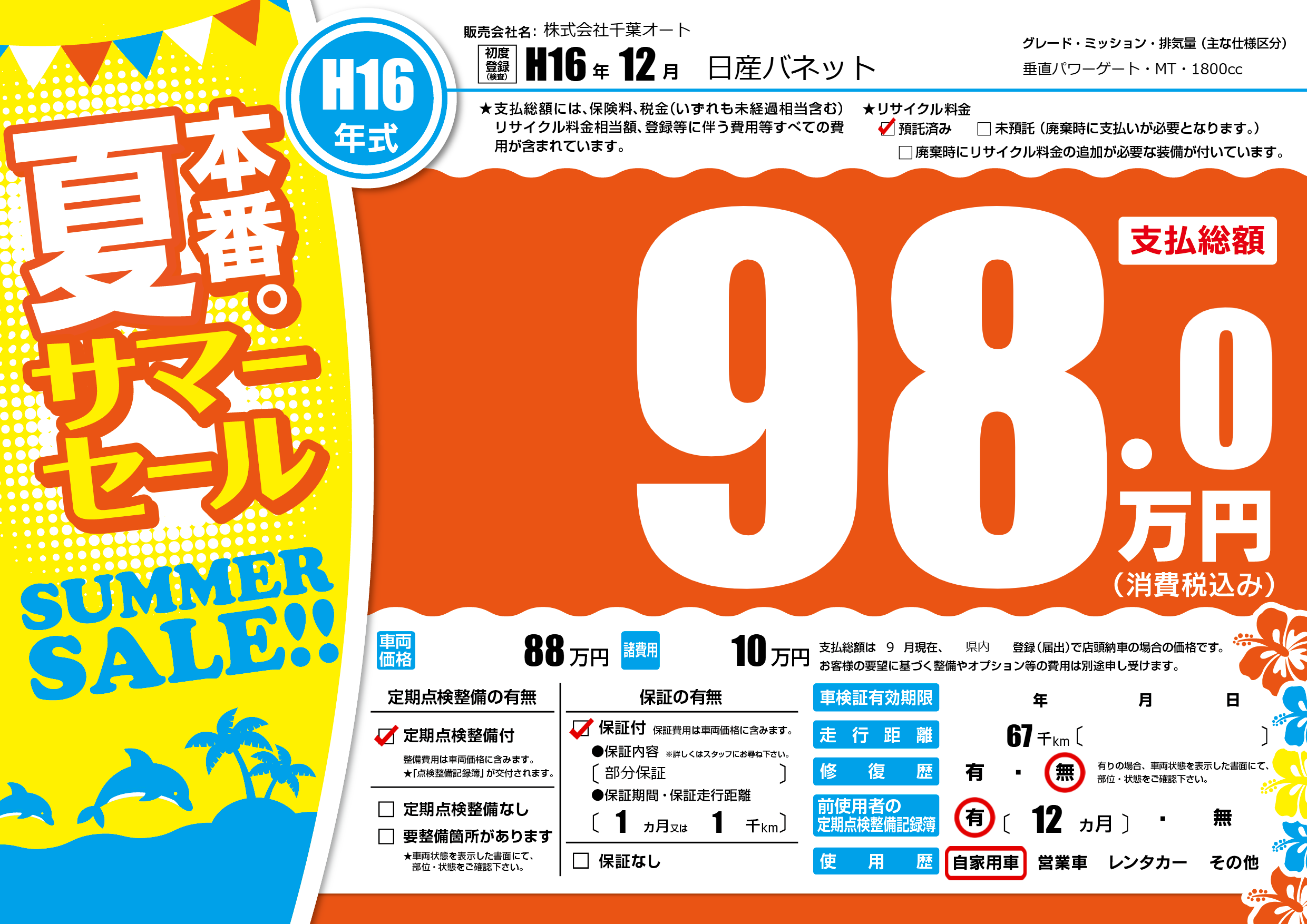 | 車名 | 日産バネット | グレード ミッション 排気量 |