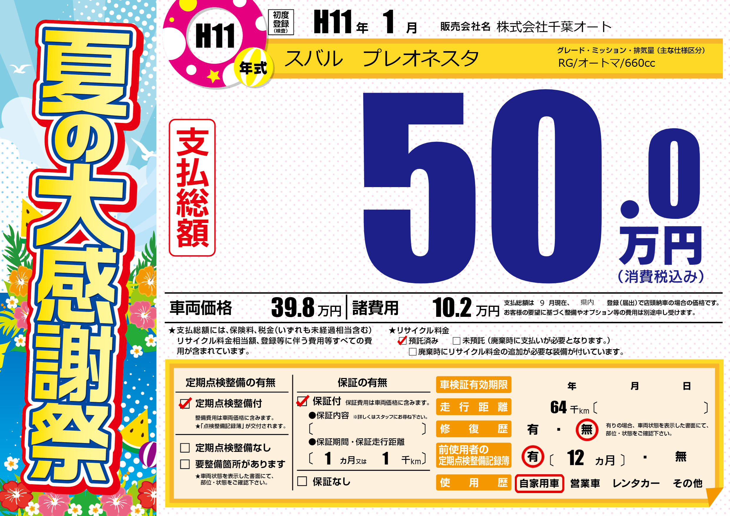 | 車名 | スバル プレオネスタ | グレード ミッション 排気量 |