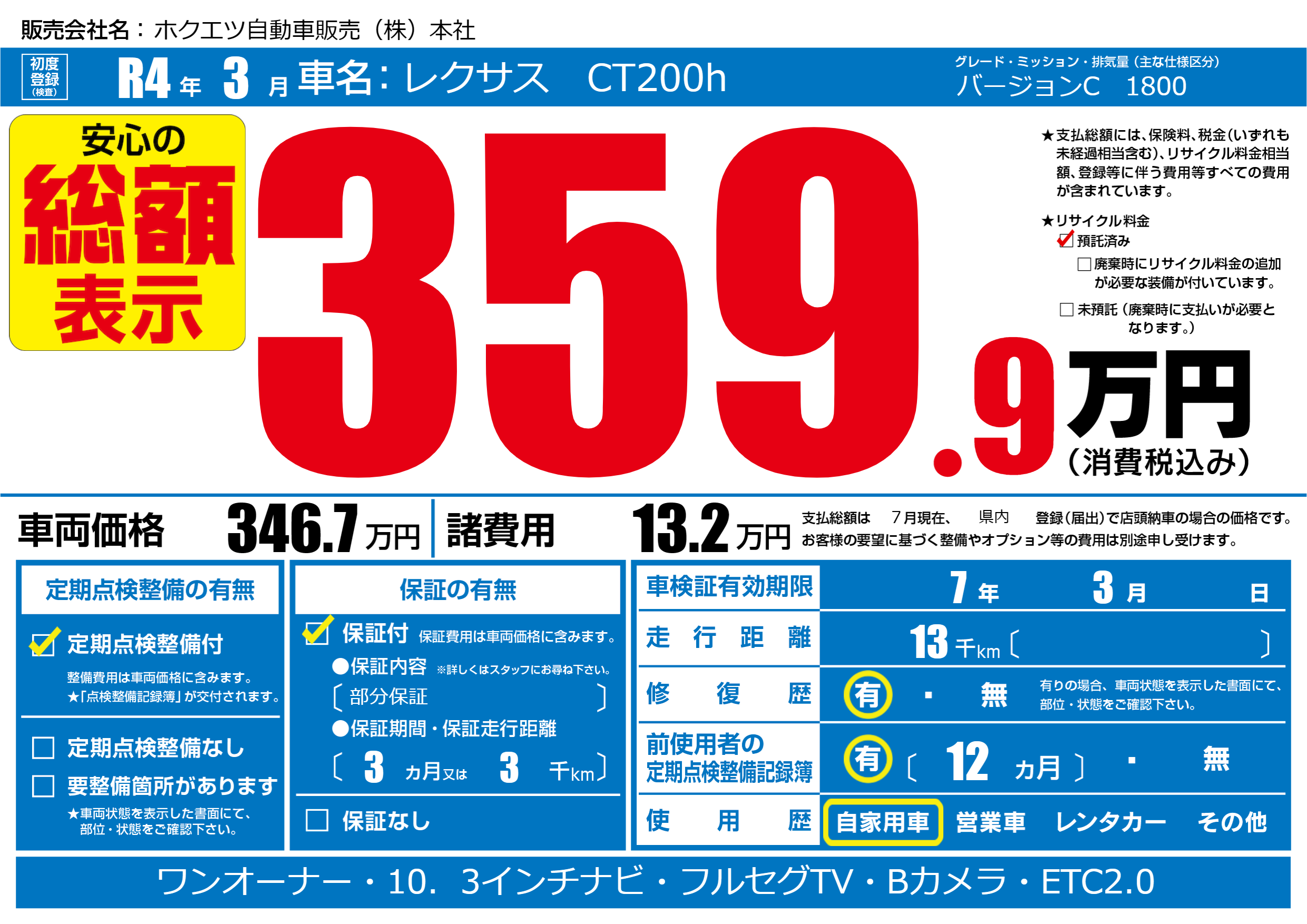 | 車名 | レクサス CT200h | グレード ミッション 排気量 |