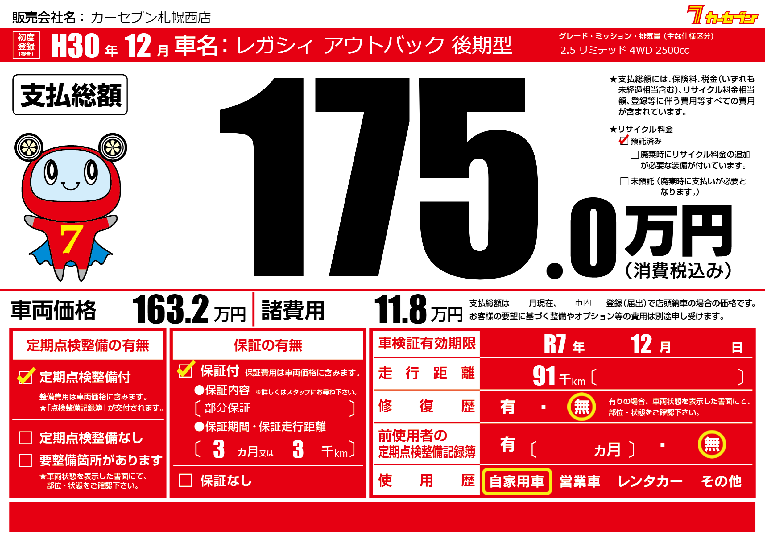 | 車名 | レガシィ アウトバック 後期型 | グレード ミッション 排気量 |