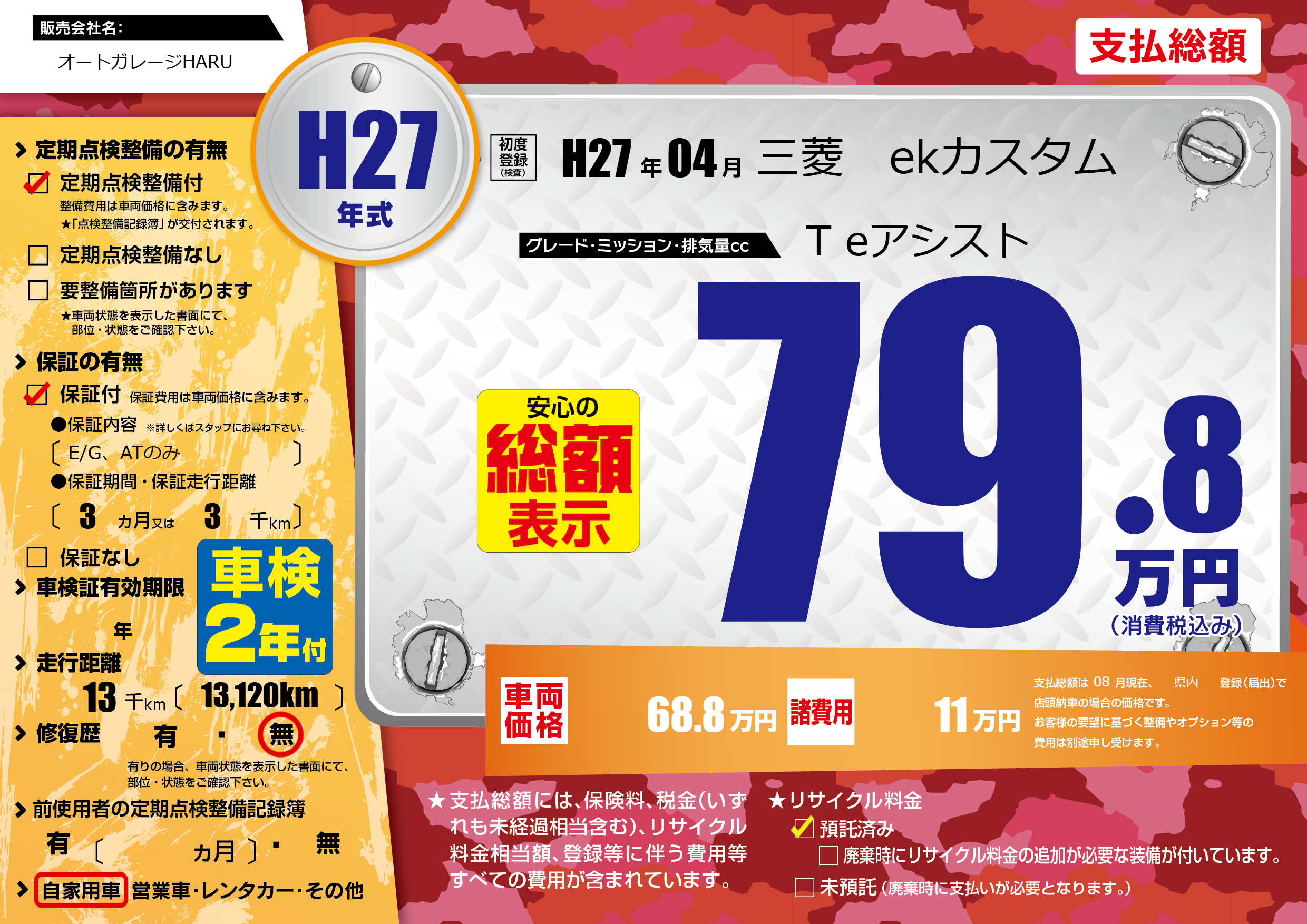| 走行キロ | 1.3万km | 初年度登録 | H27年04月 |