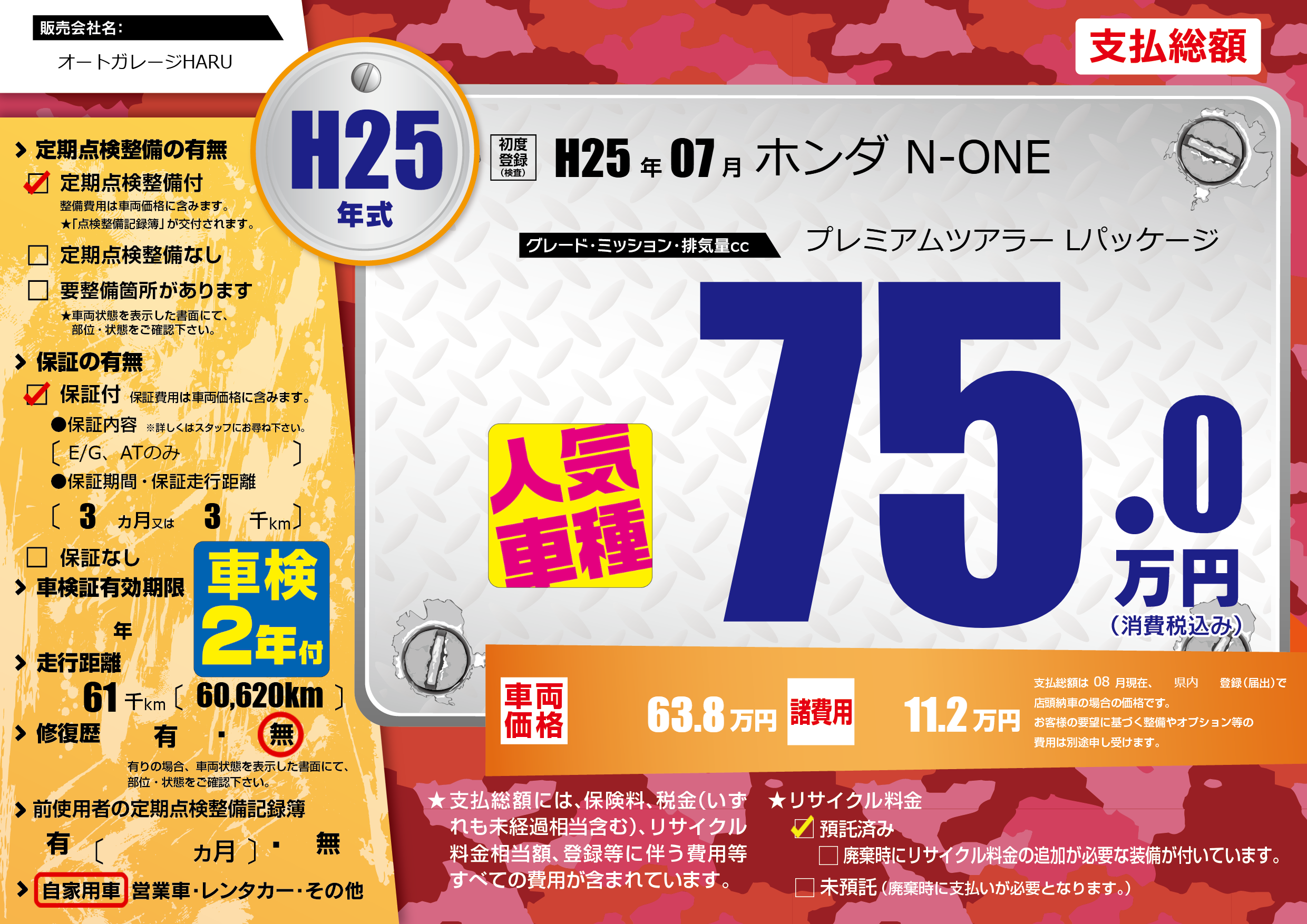 | 車名 | ホンダ N-ONE | グレード ミッション 排気量 |