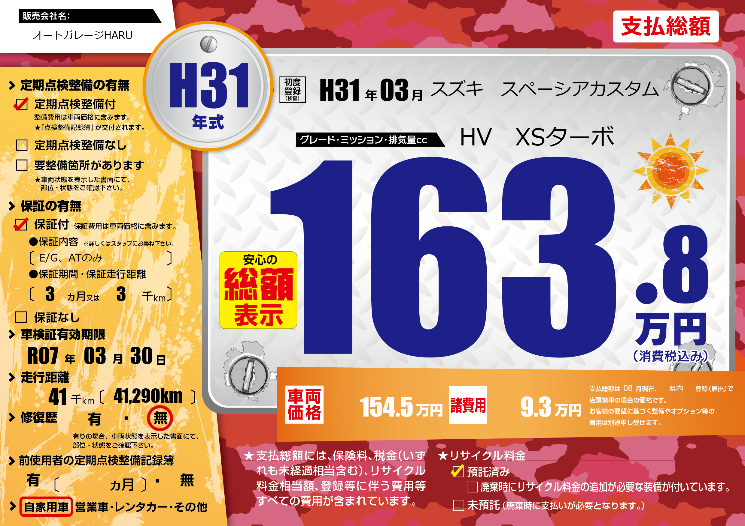 | 車名 | スズキ スペーシアカスタム | グレード ミッション 排気量 |