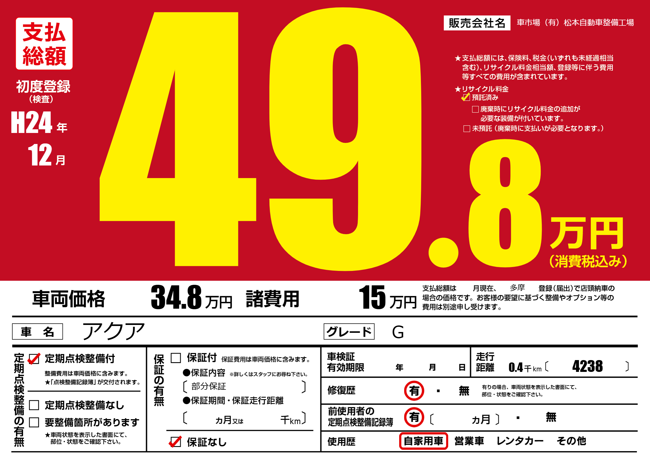 | 走行キロ | - | 初年度登録 | H24年12月 |