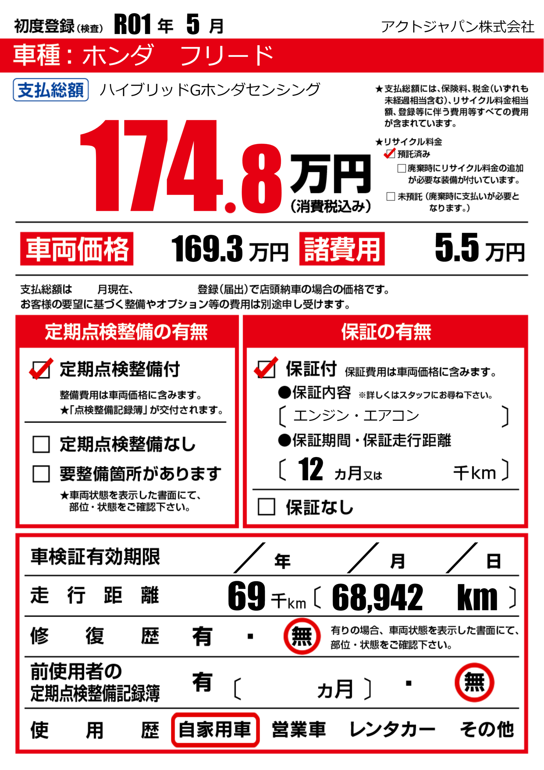 | 車名 | ホンダ フリード | グレード ミッション 排気量 |