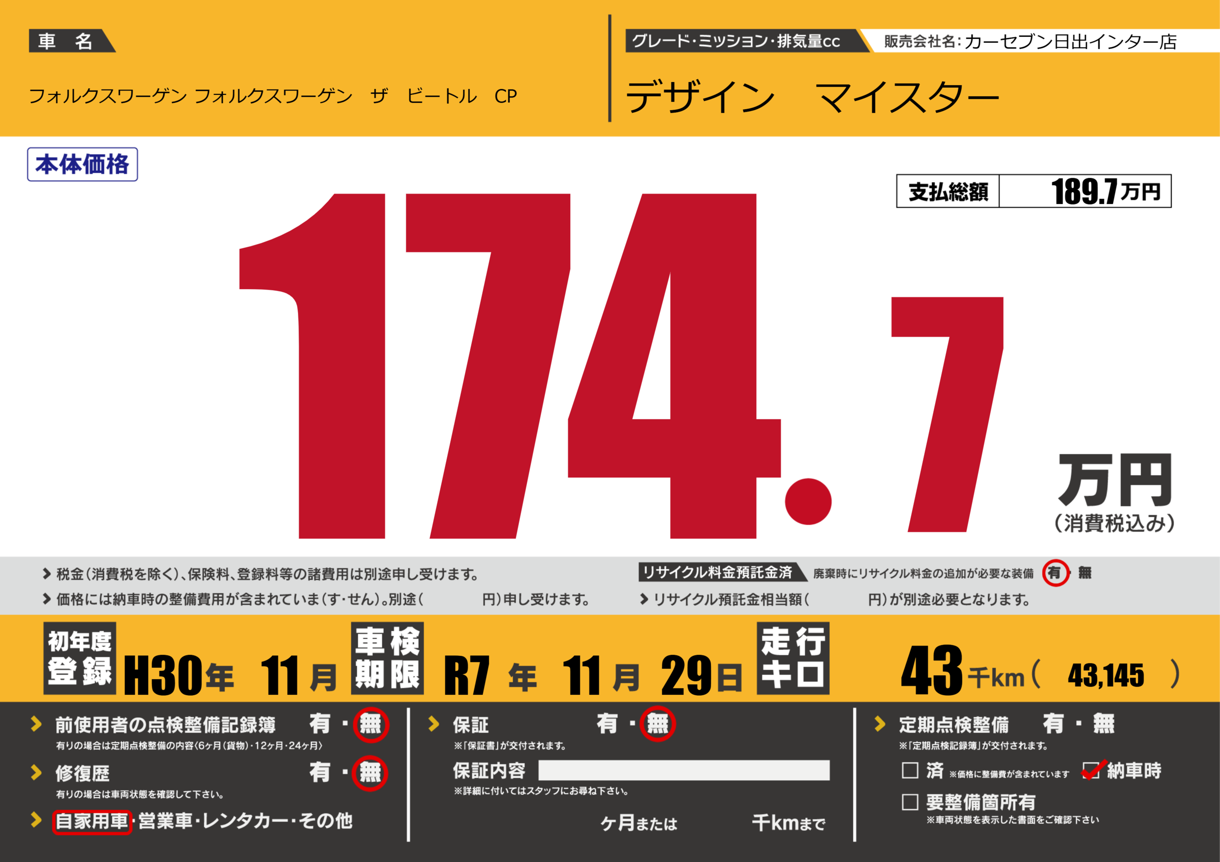 | 車検制限 | R7年 11月 29日 | ||