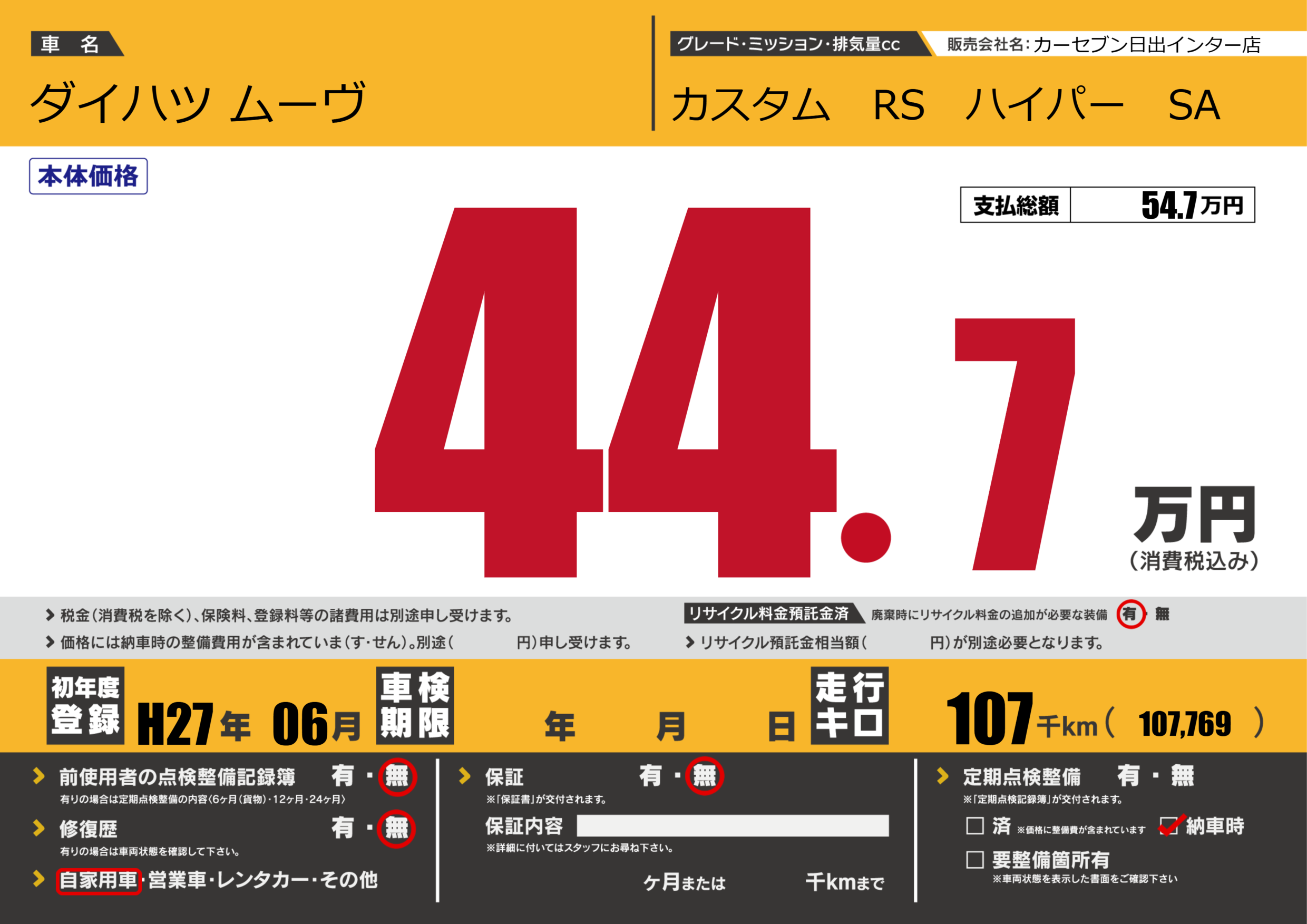 | 走行キロ | 10.7万km | 初年度登録 | H27年06月 |