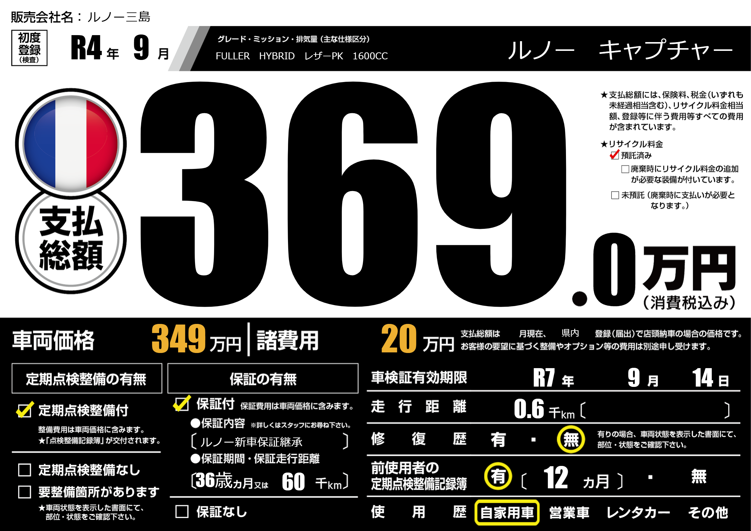 保証なし 保証内容(ルノー新車保証継承) 36歳ヶ月または(60)千kmまで |