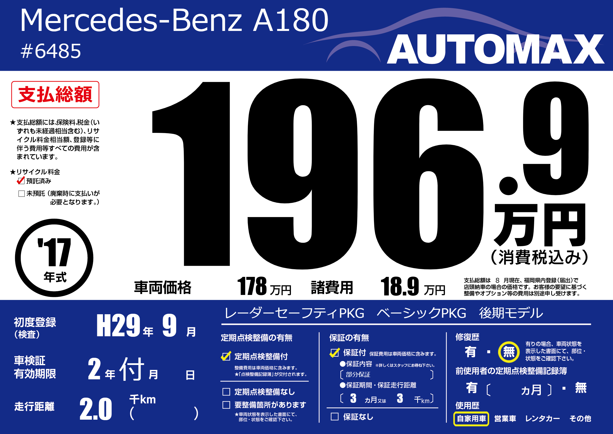 | 車名 | Mercedes-Benz A180 | グレード ミッション 排気量 |