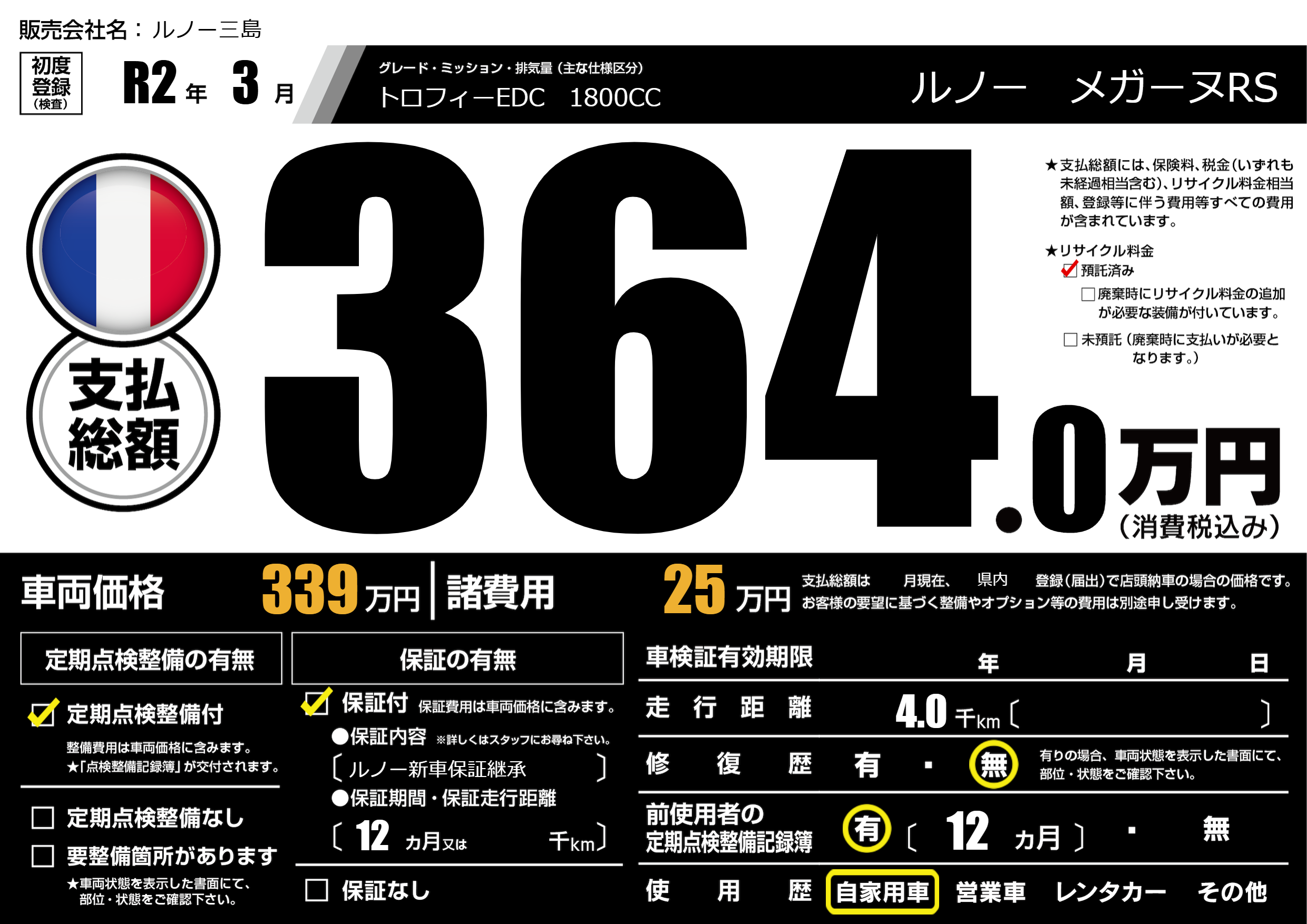 | 車名 | ルノー メガーヌRS | グレード ミッション 排気量 |