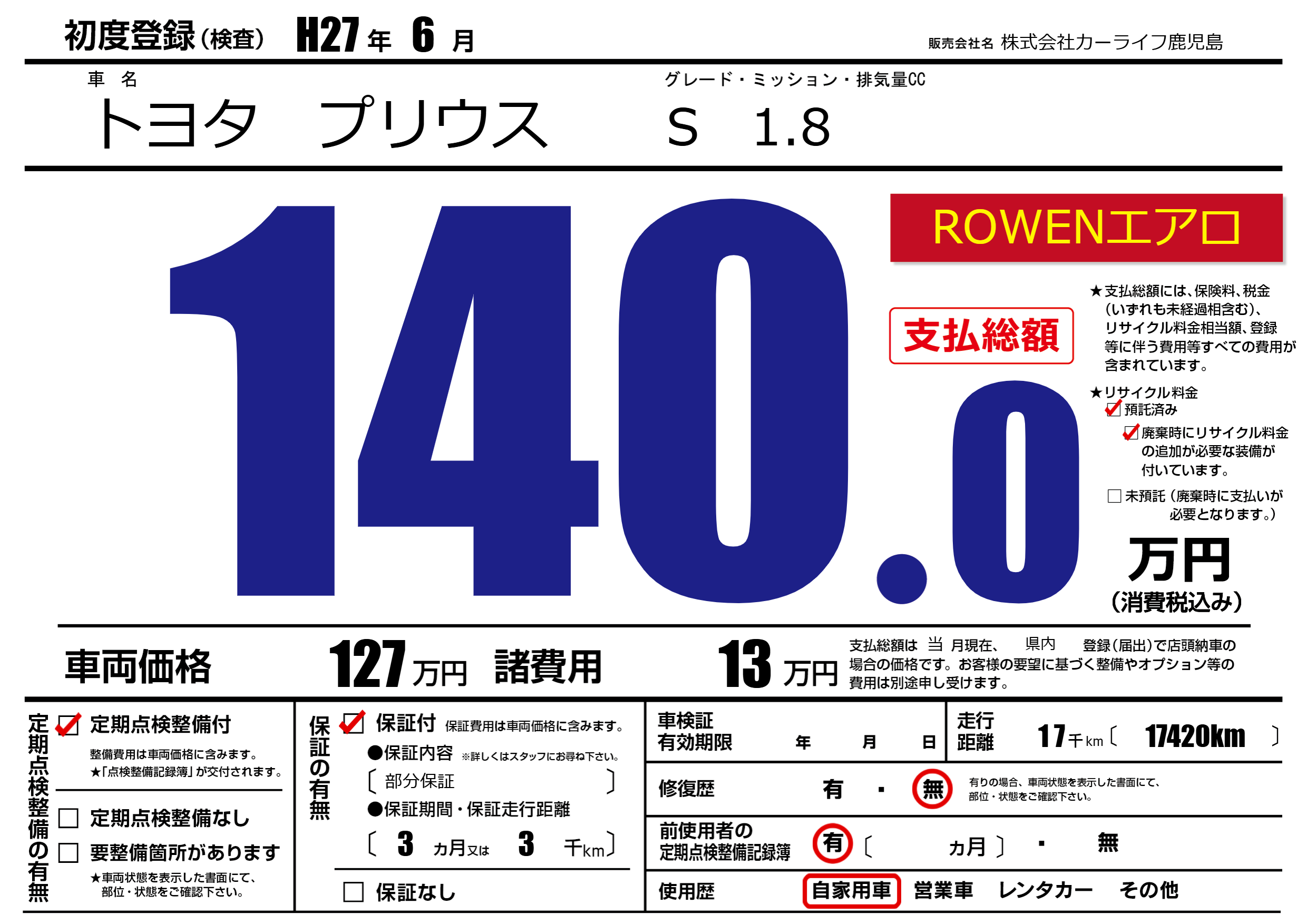 | 車名 | トヨタ プリウス | グレード ミッション 排気量 |