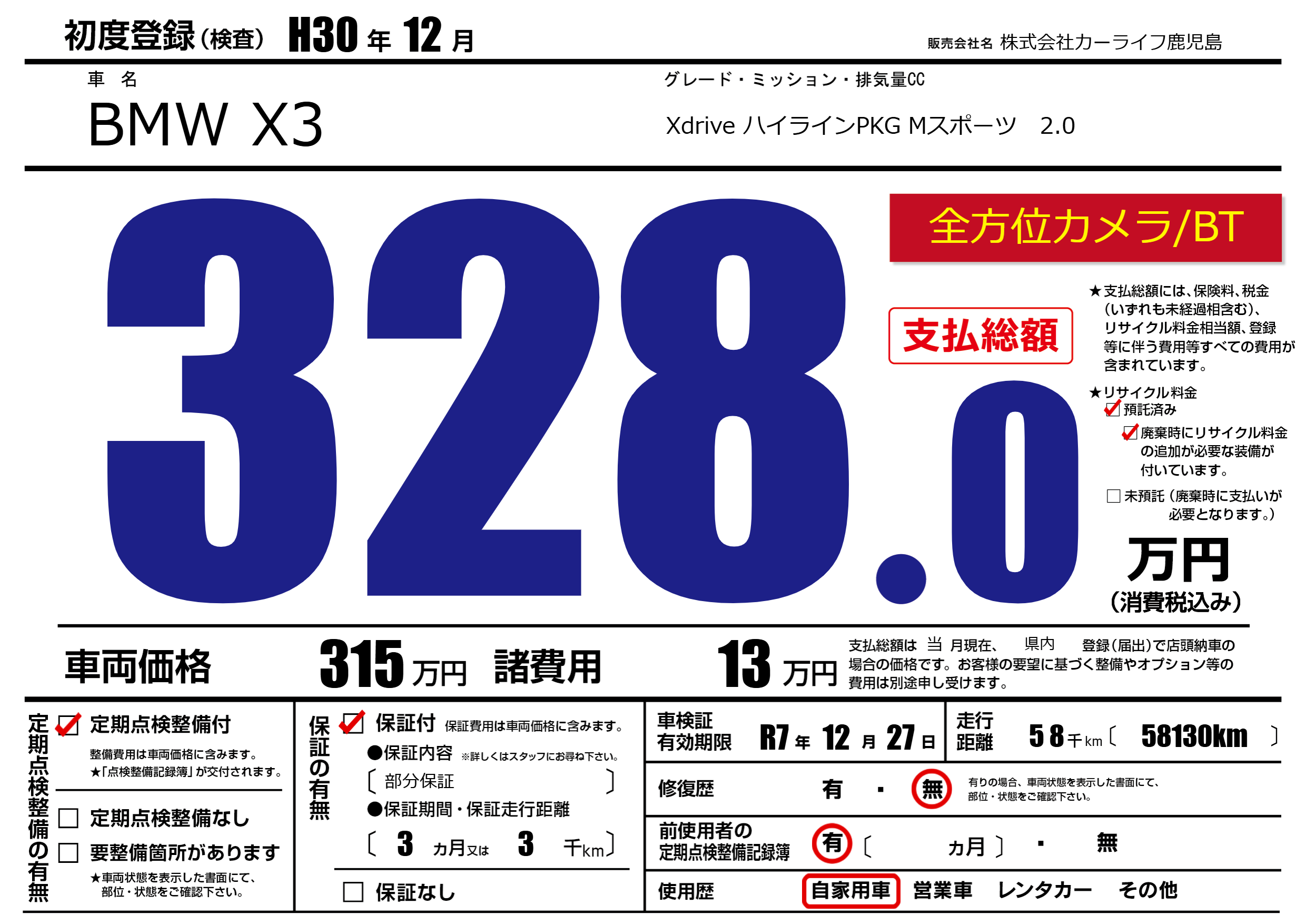 | 車名 | BMW X3 | グレード ミッション 排気量 |