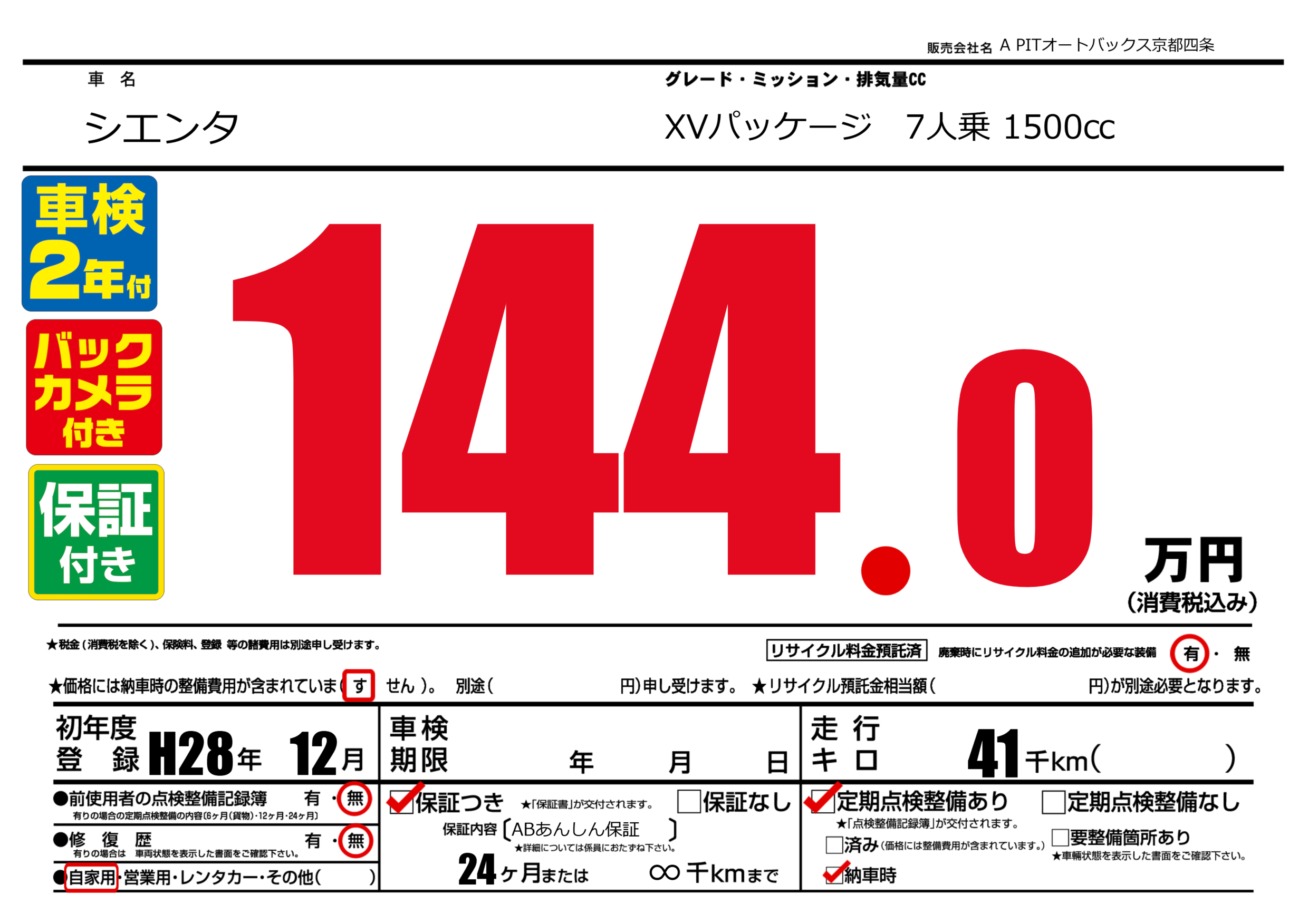 保証なし 保証内容(ABあんしん保証) 24ヶ月または(∞)千kmまで |