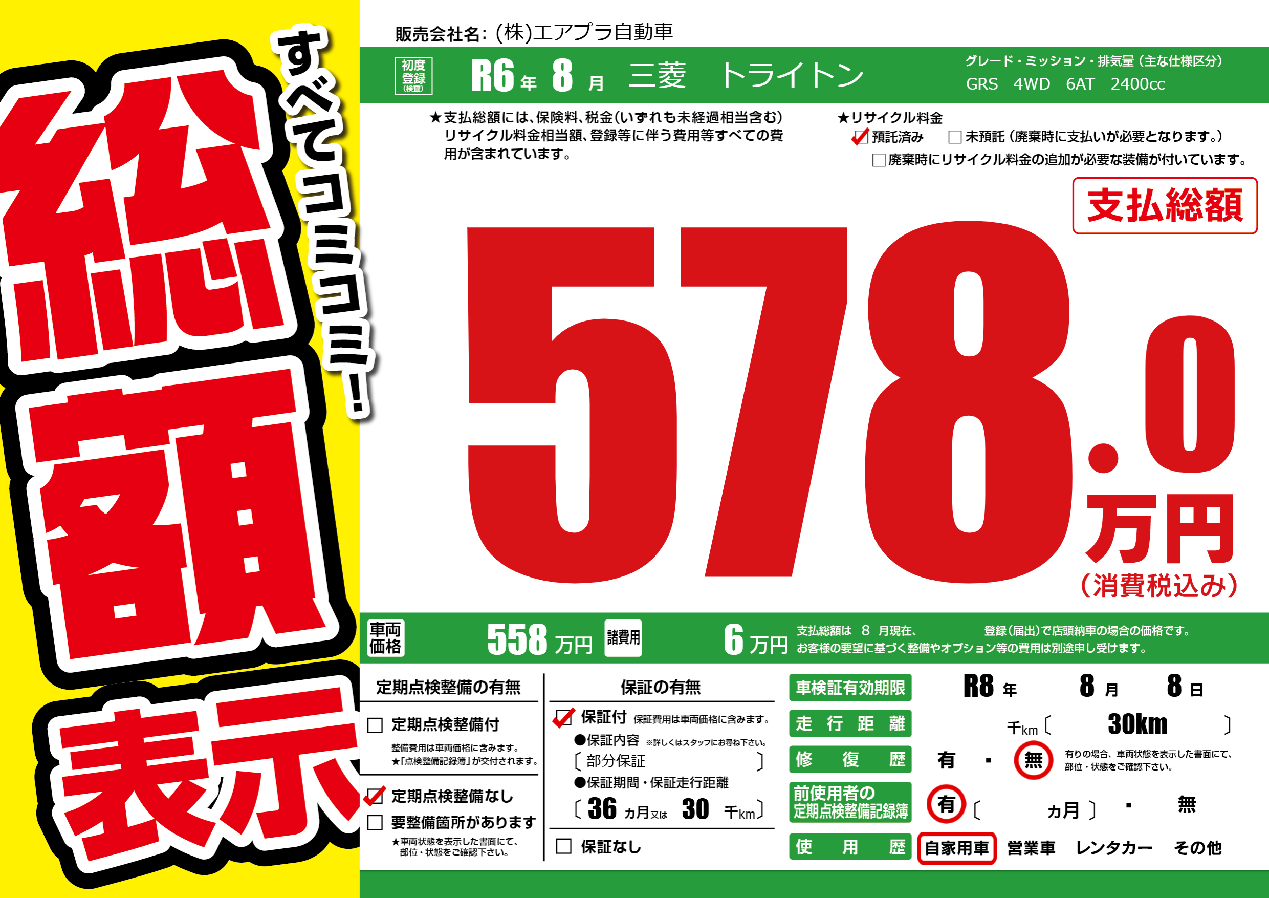 | 走行キロ | - | 初年度登録 | R6年8月 |