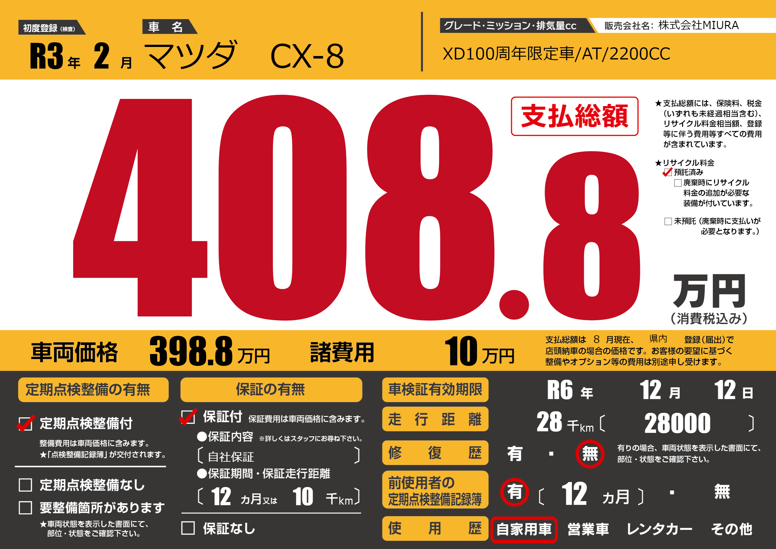 | 車名 | マツダ CX-8 | グレード ミッション 排気量 |