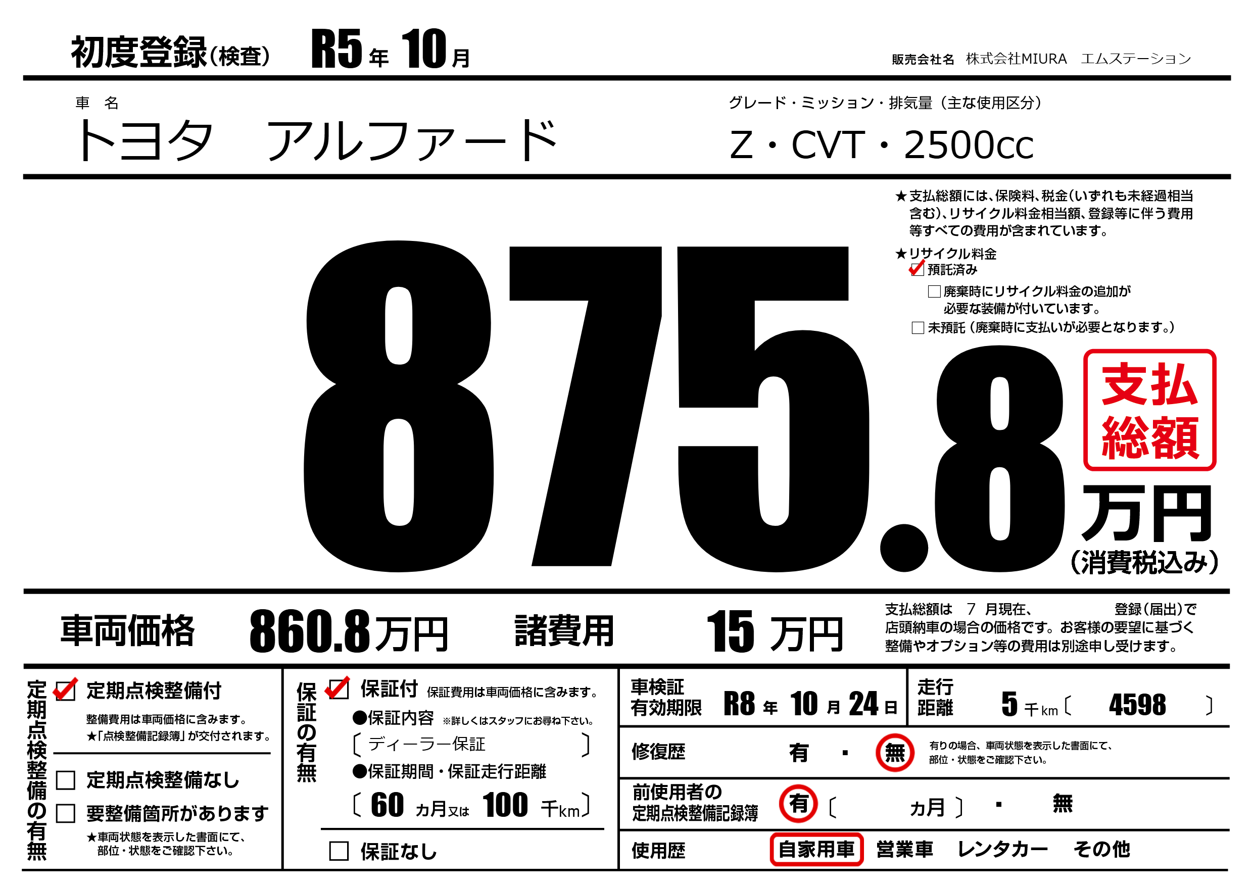 | 走行キロ | 0.5万km | 初年度登録 | R5年10月 |