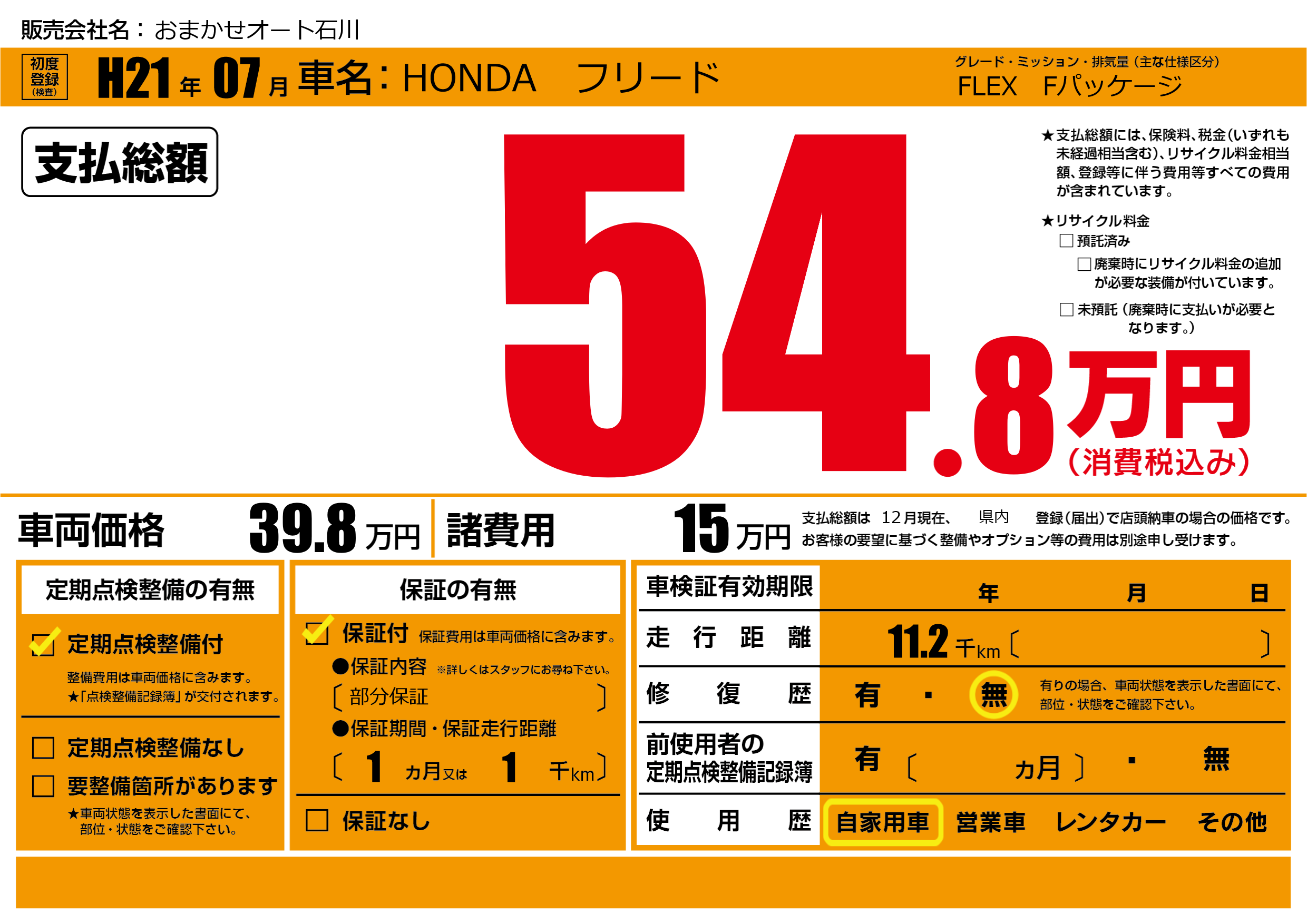 | 車名 | HONDA フリード | グレード ミッション 排気量 |