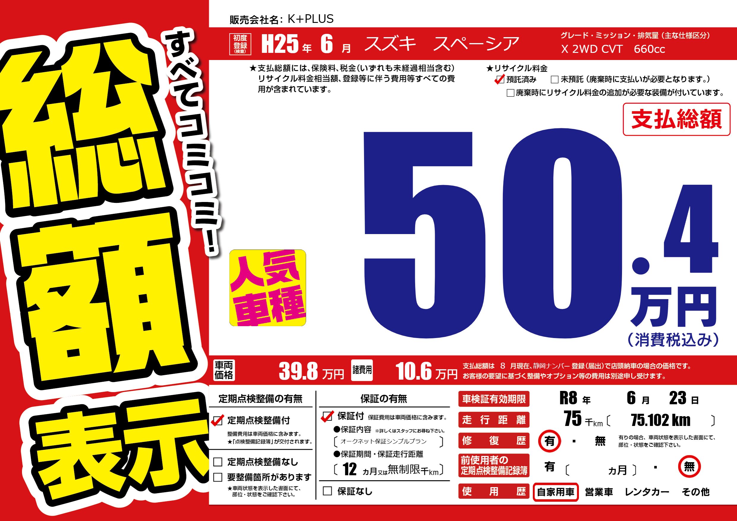 | 車名 | スズキ スペーシア | グレード ミッション 排気量 |