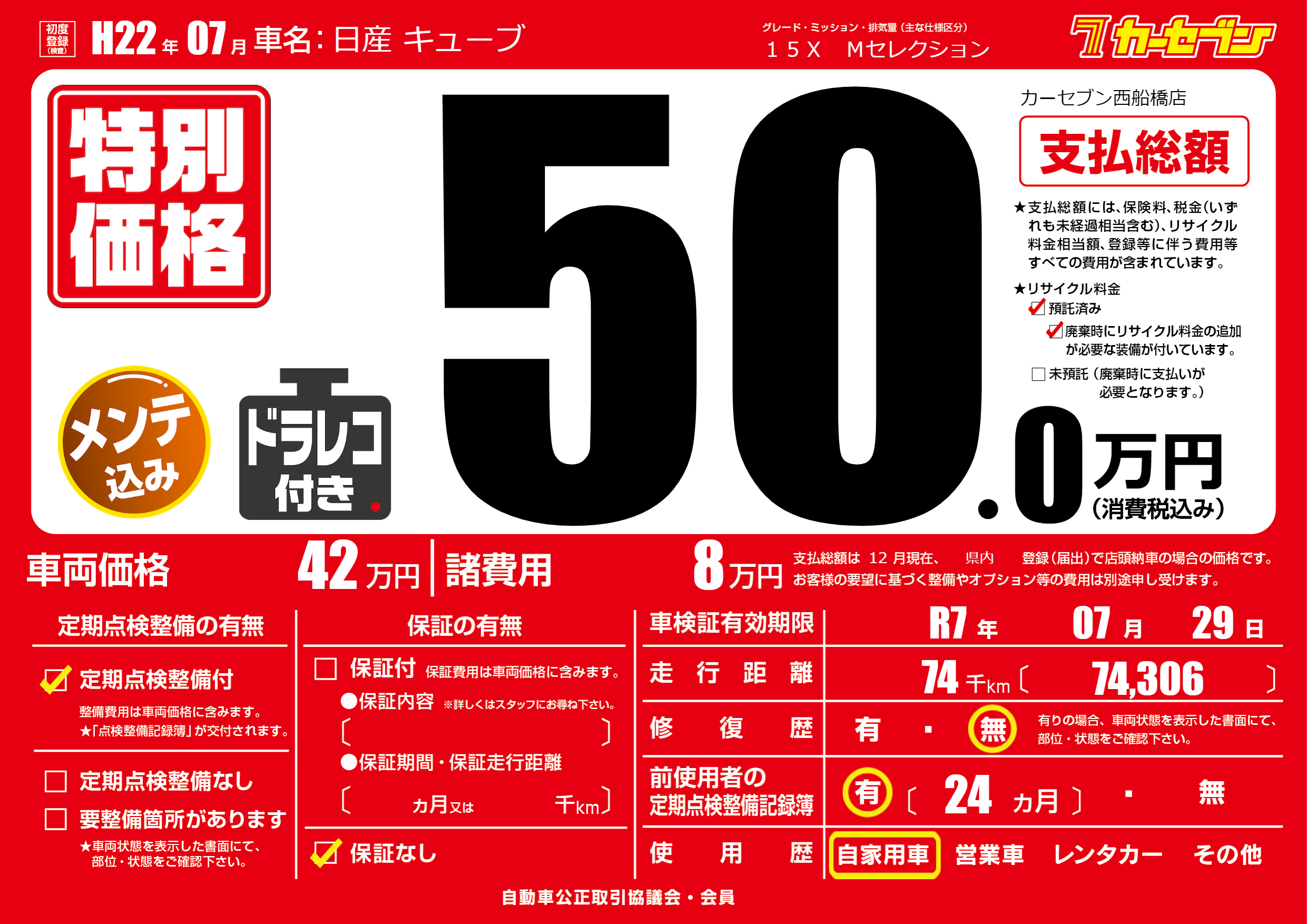| 車名 | 日産 キューブ | グレード ミッション 排気量 |