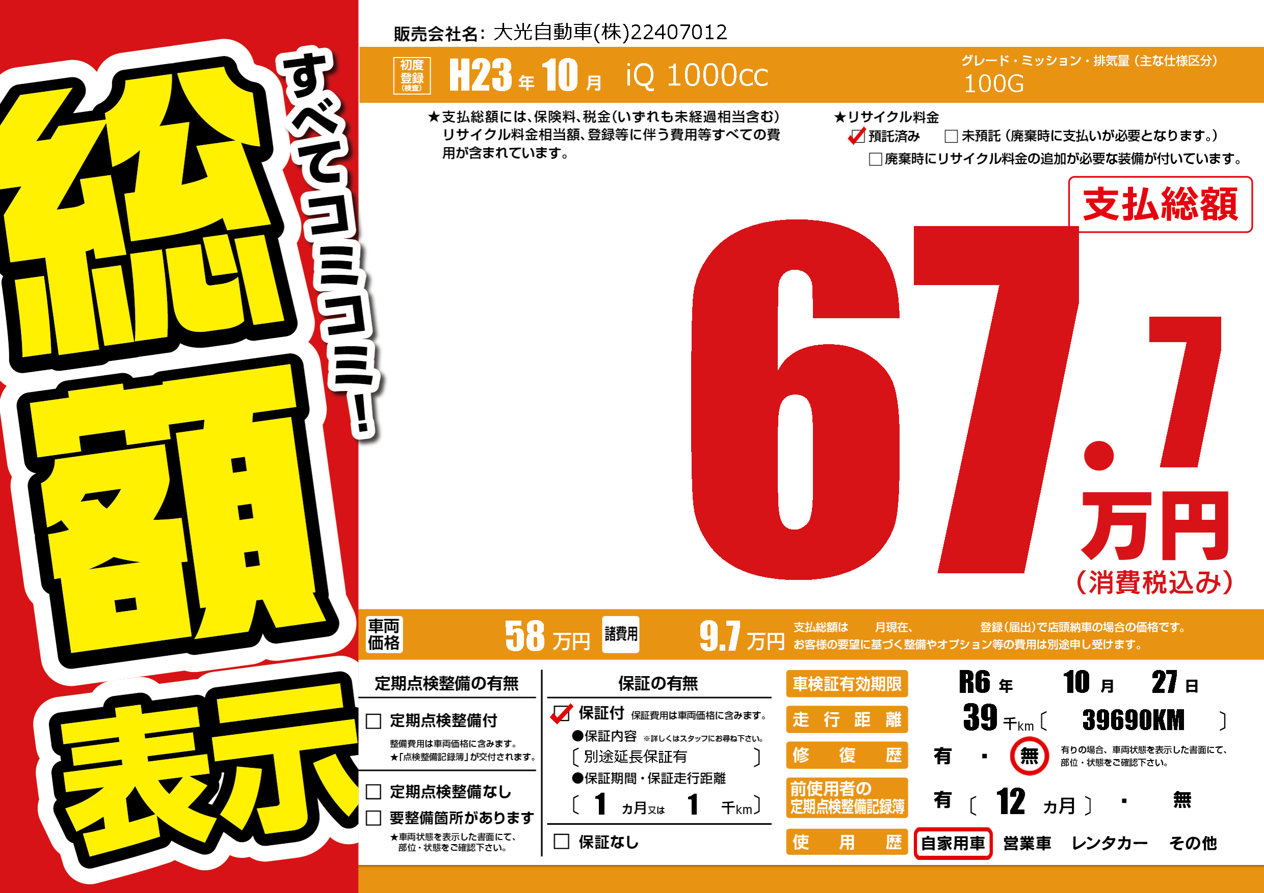 | 車名 | iQ 1000cc | グレード ミッション 排気量 |
