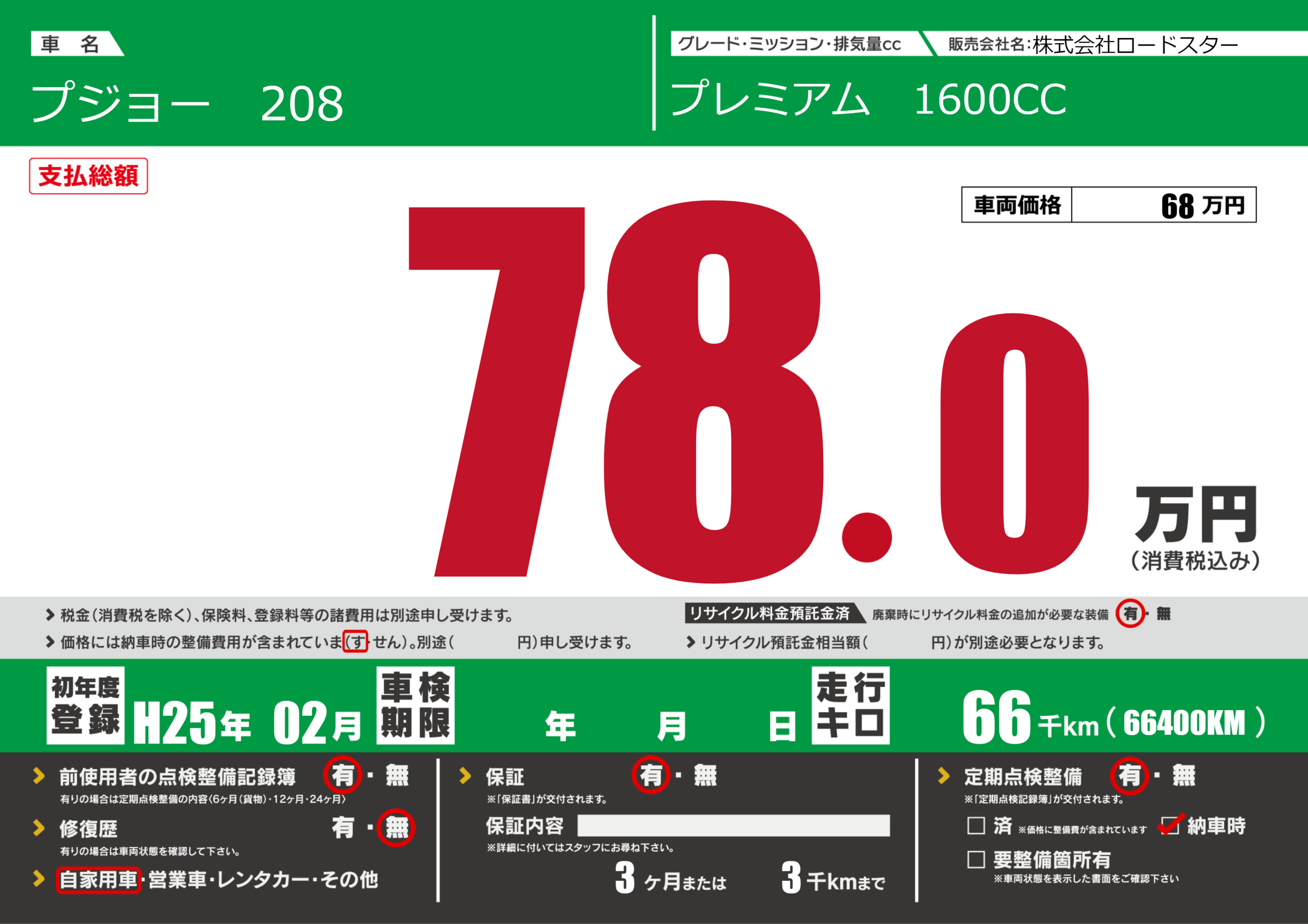 | 定期点検整備 | 定期点検整備あり 納車時あり | ||