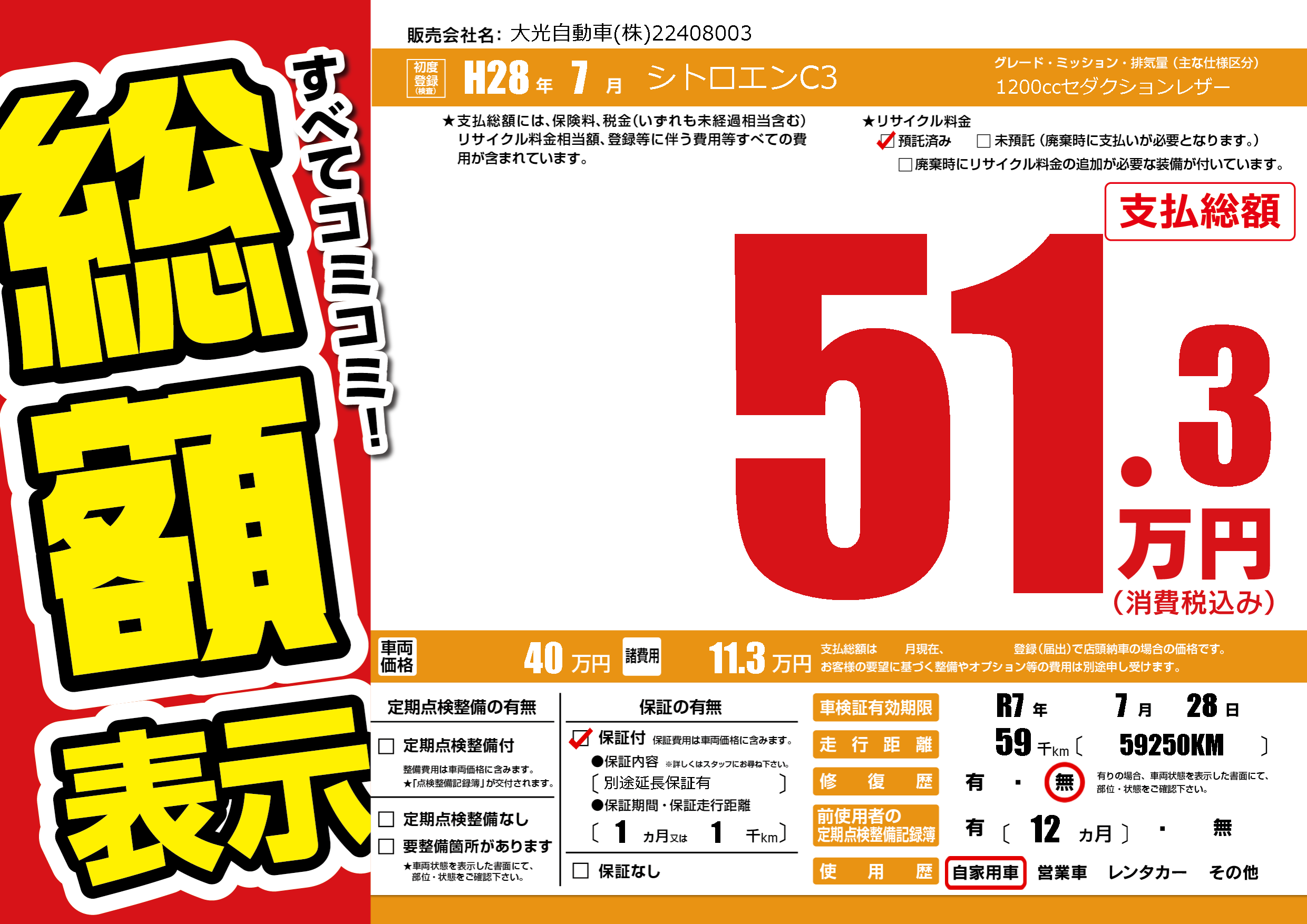 | 車名 | シトロエンC3 | グレード ミッション 排気量 |