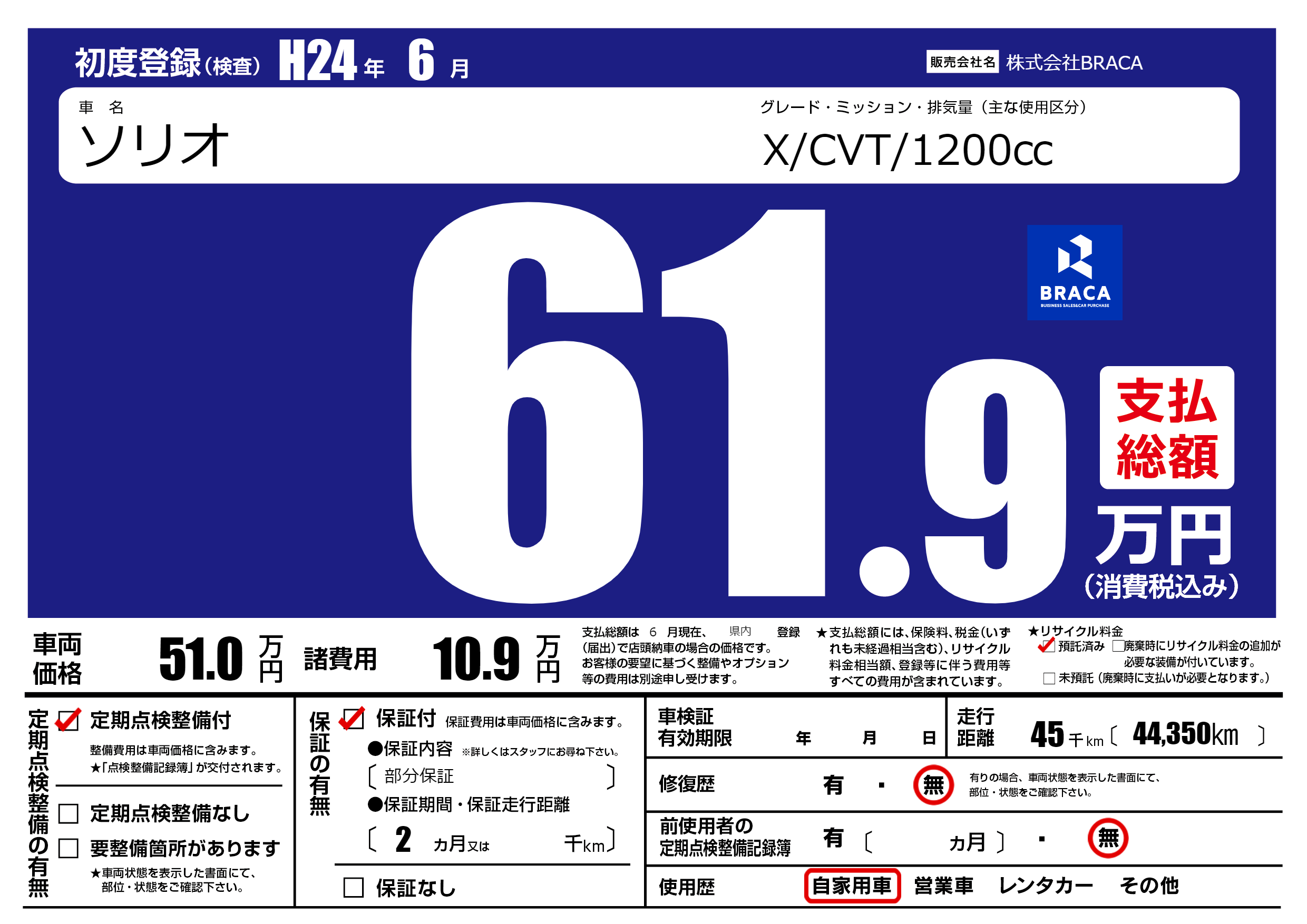 | 車名 | ソリオ | グレード ミッション 排気量 |