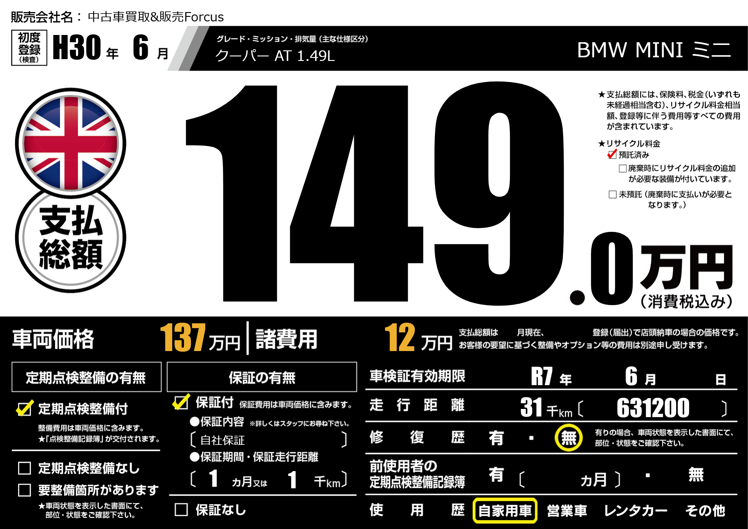 | 車名 | BMW MINI ミニ | グレード ミッション 排気量 |