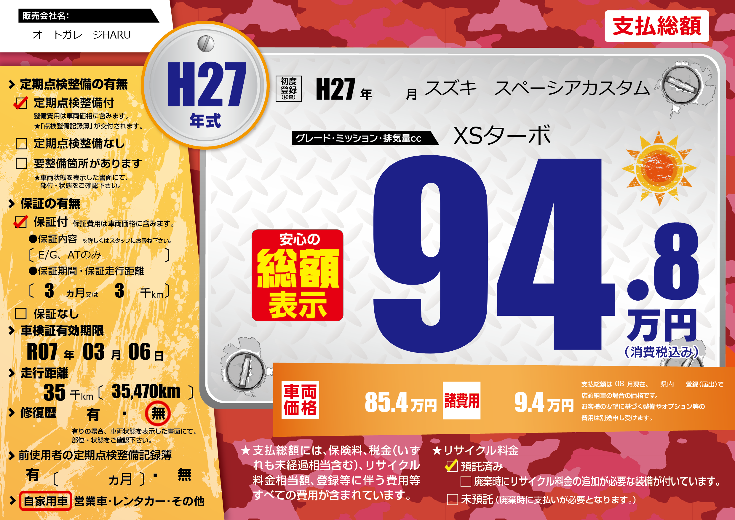 | 車名 | スズキ スペーシアカスタム | グレード ミッション 排気量 |