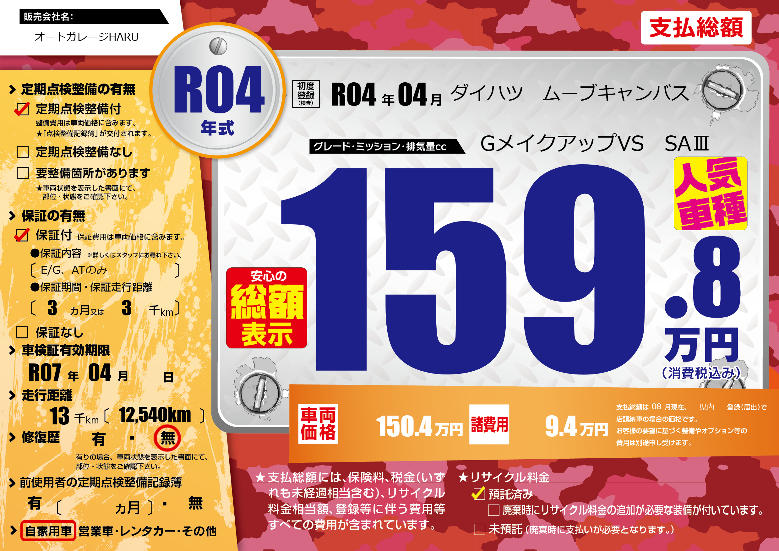 | 走行キロ | 1.3万km | 初年度登録 | R04年04月 |