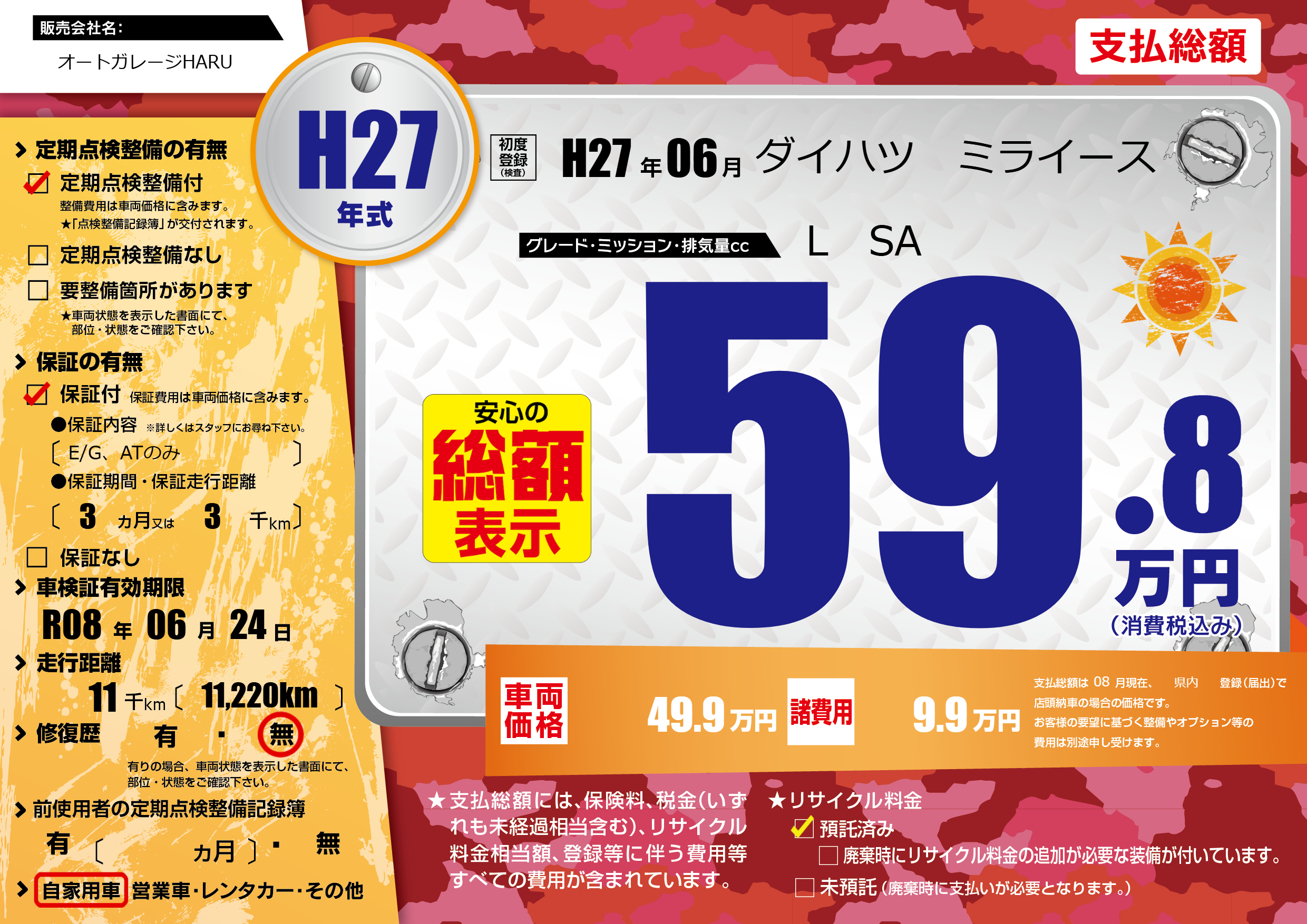 | 車名 | ダイハツ ミライース | グレード ミッション 排気量 |