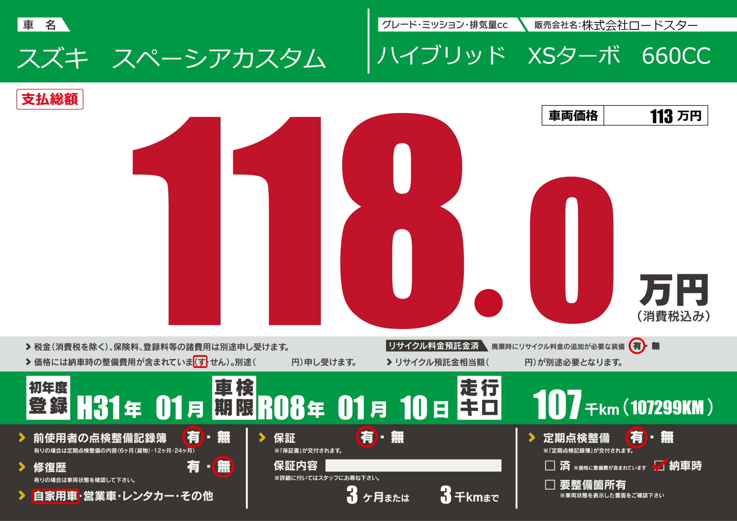 | 定期点検整備 | 定期点検整備あり 納車時あり | ||